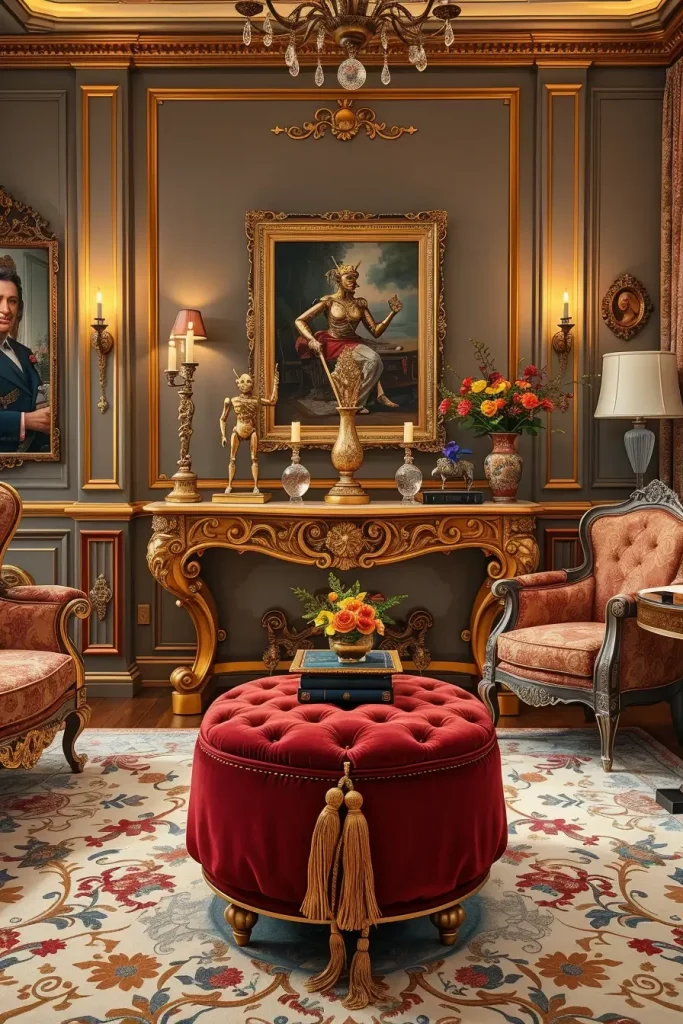 I would also put a whimsical sculpture in this area, maybe a resin bust with old-fashioned sunglasses. It provides character and mirrors the theatrically of Rococo without being preciously.