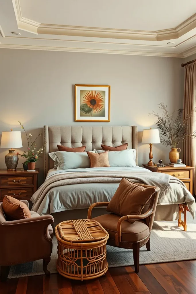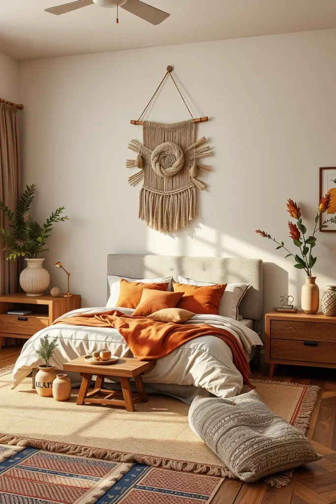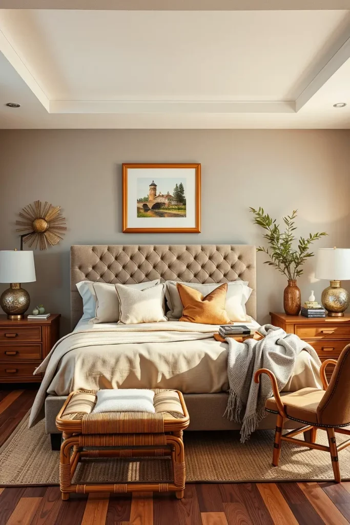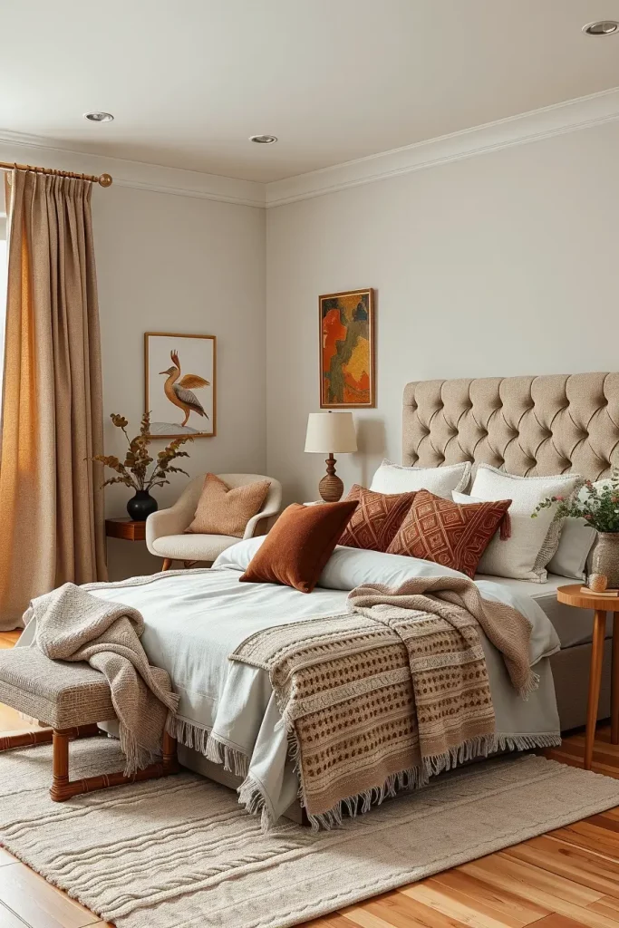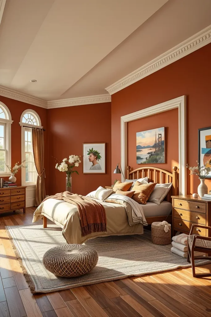 I suggest painting walls with softer, earthier tones like taupe and muted rust, pairing them with a deep moss green accent rug. Wooden nightstands, teracotta planters, cream bedding with ochre accent pillows, and stoneware lamps with linen shades bring a warm and handmade feeling to the room, completing the restful aesthetic.