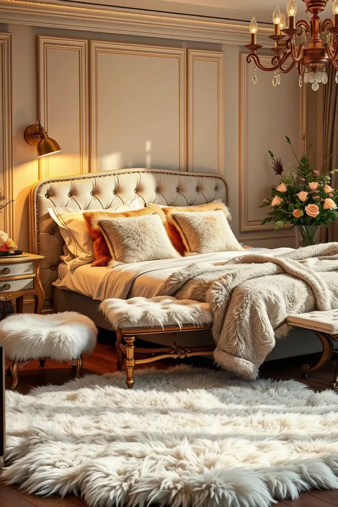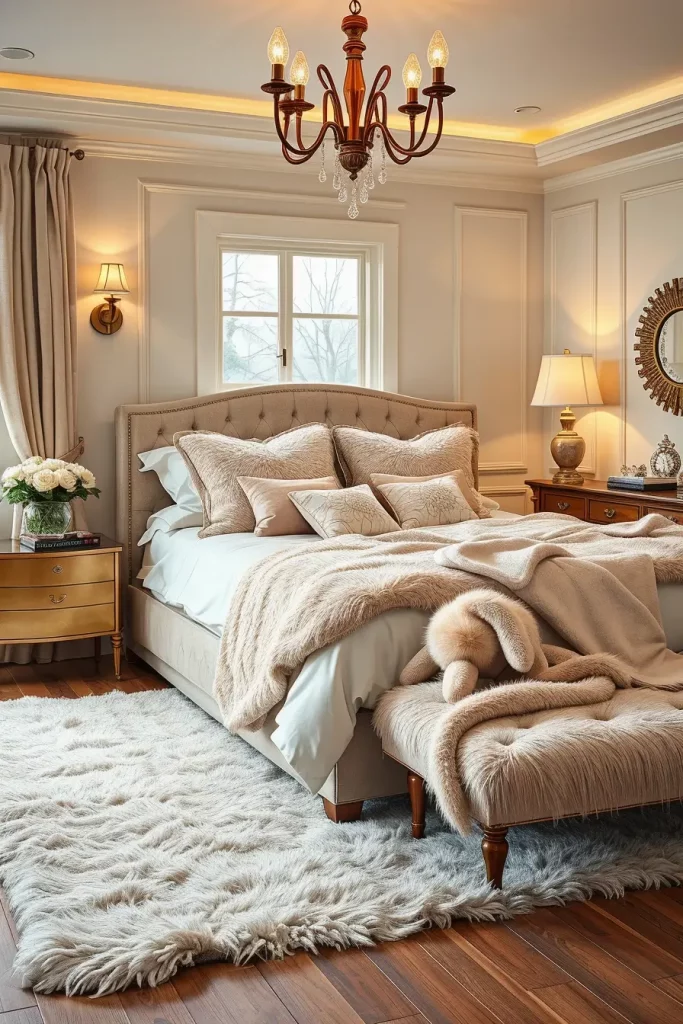In a recent design project, I used a linen duvet and layered a faux fur blanket over the top. I also used two oversized faux fur pillows in a soft, champagne color on a boucle bench. To add to the glamour, I placed a matching faux fur rug next to the bed which also keeps the cold tile floor cozy. The glamorous touches are effortlessly comforting to the bed design.