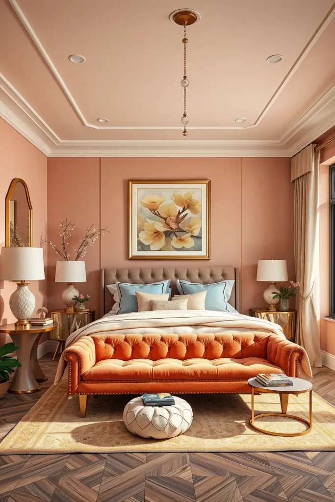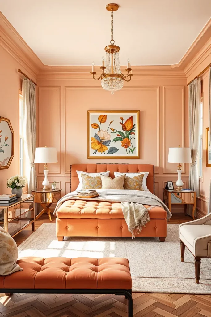 For the first suggestion, I would recommend blush-toned throw pillows and warm-light, rattan-shaded lamps complemented by blush and apricot colored accessories. The warm beige and sunrise peach accent walls would look fabulous with satin and matte throw pillows. These items complete the look and in effect, a blush velvet bench or a bed frame would tie the space together.