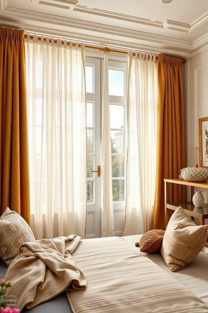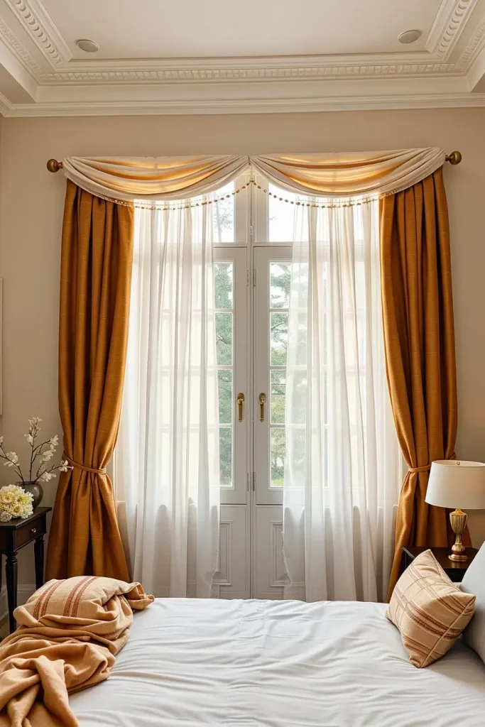 I often use light-filtering sheer curtains in cream or pale camel paired with heavier wool or velvet drapes in caramel or bronze. This combination not only enhances the window, but it also provides extra insulation and privacy. While doing this, the curtain rods are also important, and as such, I would recommend brass, or matte black with detailed finials for a more polished look. Floor-length curtains should just kiss the ground for the most luxurious feel.