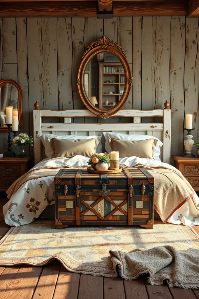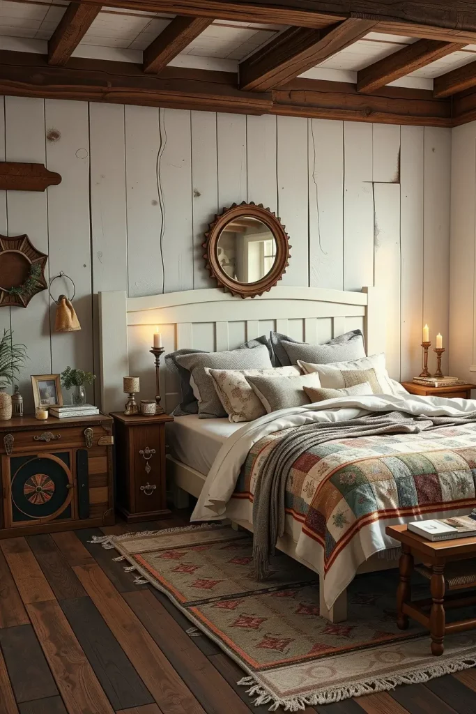 Some of my favorite warm rustic elements to add in a space are the framed, full-length mirrors made with a distressed finish, a vintage-style trunk used as a bench at the foot of the bed, and stone or ceramic candle holders. The whitewashed headboards with the antique brass lamps look stunning alongside oatmeal covered linen comforters. Handcrafted charm is reinforced by add in a crocheted throw or a patchwork quilt.