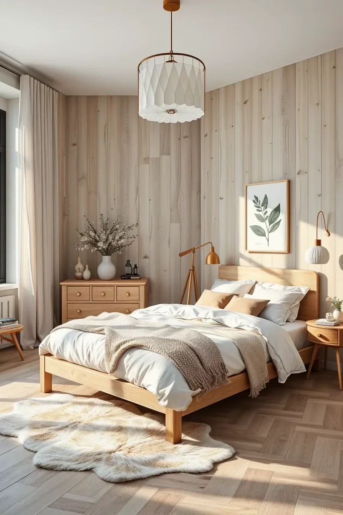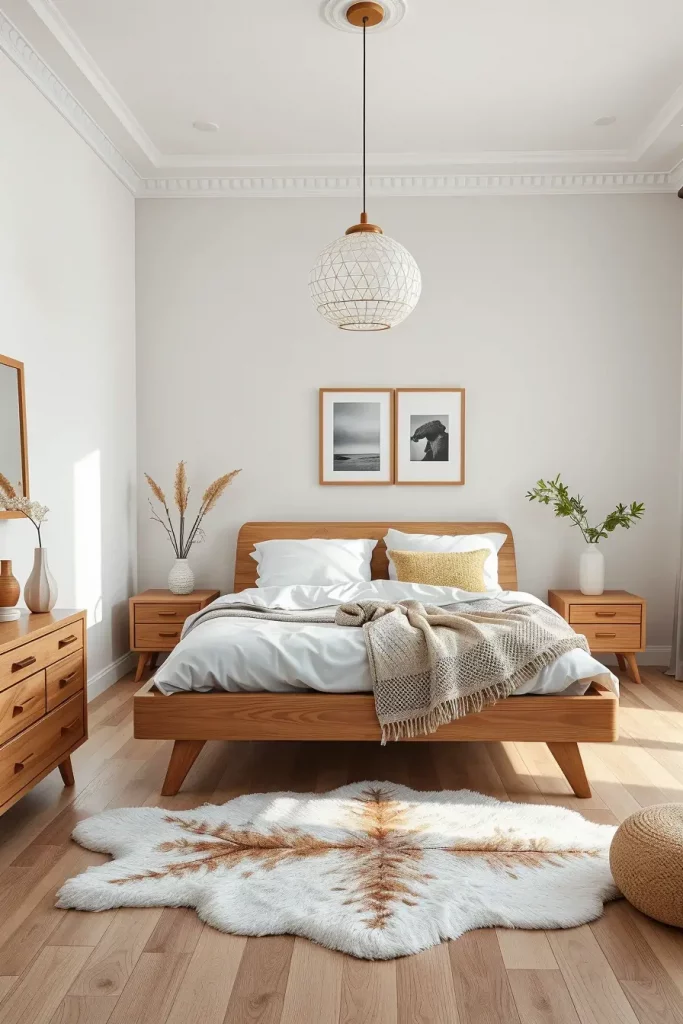 In the Scandi-warm style, I usually start with a bedroom. For this, I select a platform bed in light wood and top it with a knit throw and white or beige linens. Beside the bed, a sheepskin rug adds a cozy touch. Light oak furniture like slimline nightstands or open shelving enhances the look of spaciousness. The room is finished off with neutral toned abstract artwork and a rice paper pendant light.