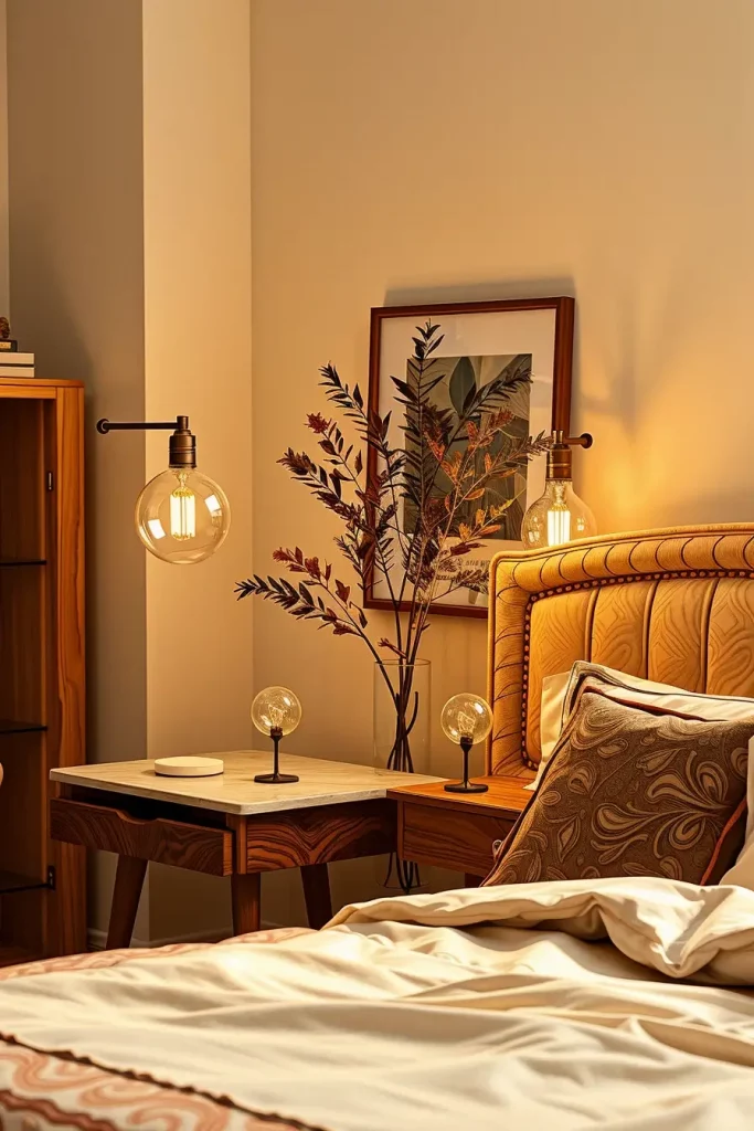 Vintage-style light fixtures add a warm, inviting, and cozy atmosphere to a room. This is because they emit a warm amber glow and are aesthetically pleasing. Vintage-style light fixtures paired with ceramic or brass vintage lamps give a timeless charm to bedrooms. This style of lighting and décor evoke warm feelings of nostalgia.