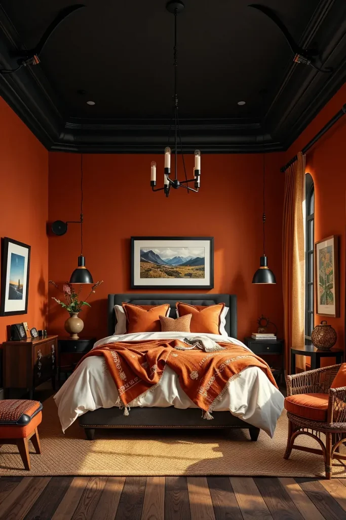 To add warmth in a bedroom, I like to incorporate black accents, and this is one trick I would suggest. The way this is done really enhances the warm tones. The warmth is derived from the walls that are painted terracotta, cognac leather, and ochre throws, which are then complemented by black. For the Warm tones, in 2025, it’s about high fashion color blocking boldly.