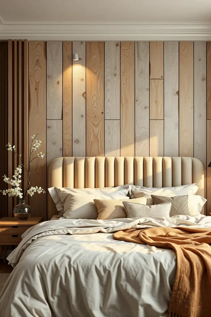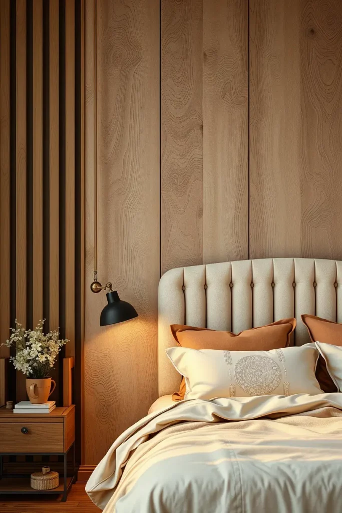 Having a smooth plaster wall can feel sterile since it lacks a visual focal point. A warm and inviting bedroom would feel completely different with a textured wall accent. As part of the warm bedroom trends for 2025, we can look forward to plaster finishes, fabric-covered walls, as well as slatted wood panels.