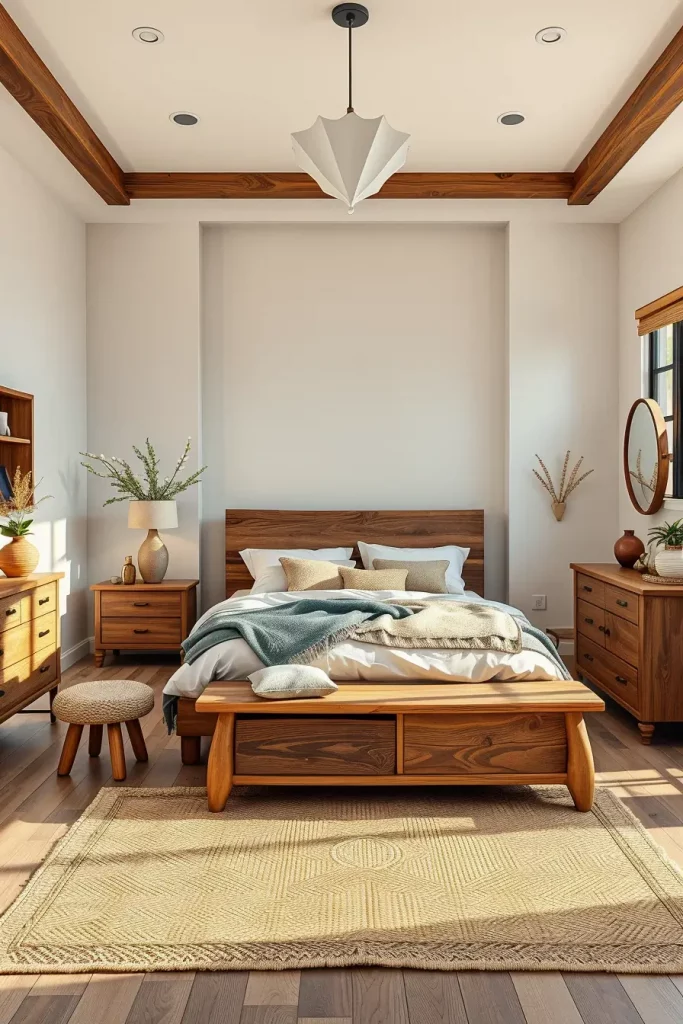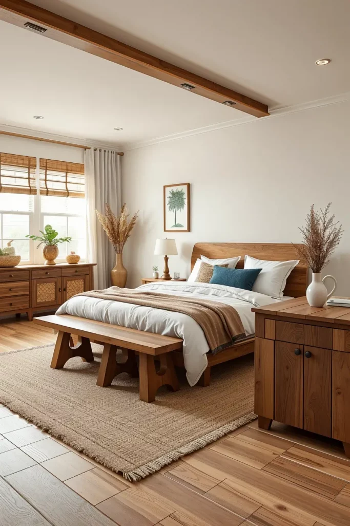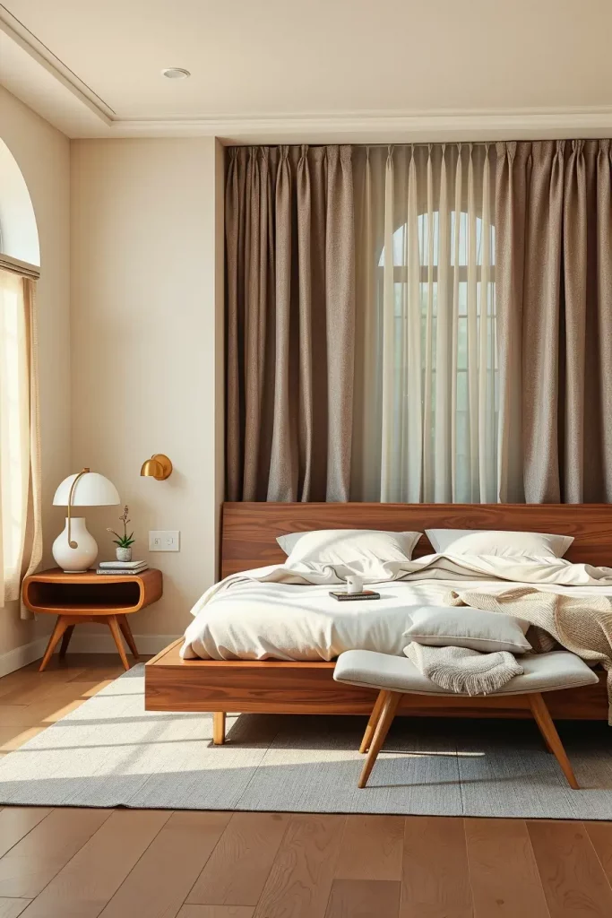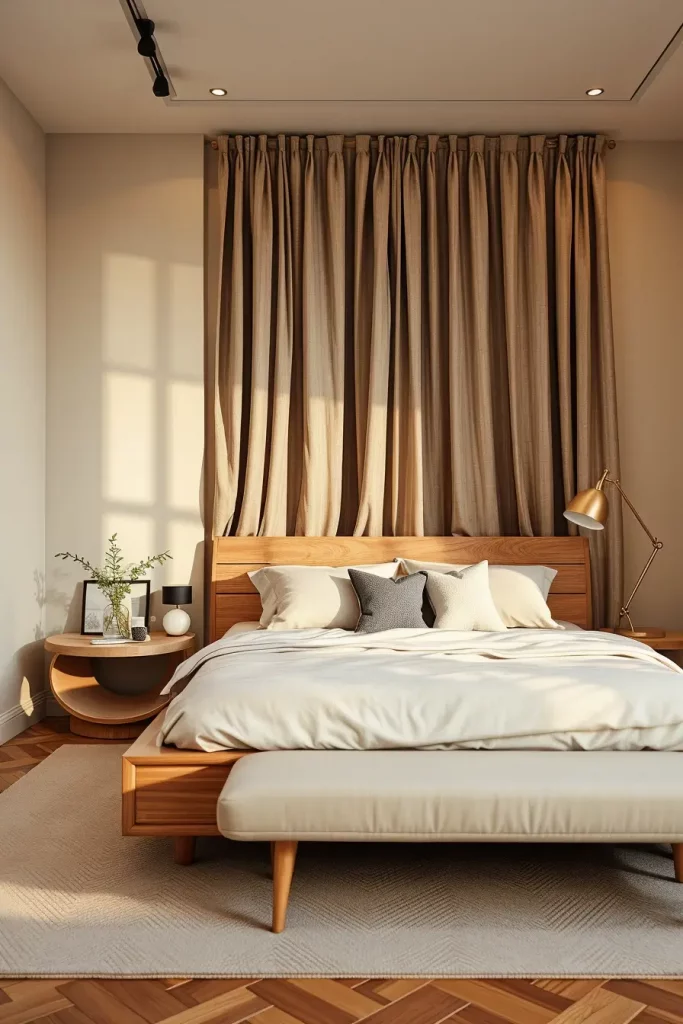 Furniture includes platform beds in natural wood, a curved bedside table, and a warm toned armchair or a bench. Soft furnishings include a wool throw, linen sheets, and textured curtains, also add comfort. The warm toned textiles and decor are soothing to the eyes while still complimenting the overall neutral palette. Storage also follows the same theme, with concealed areas to keep the bedroom peaceful. A sculptural light or wall-hung piece of art serves as the focal point.