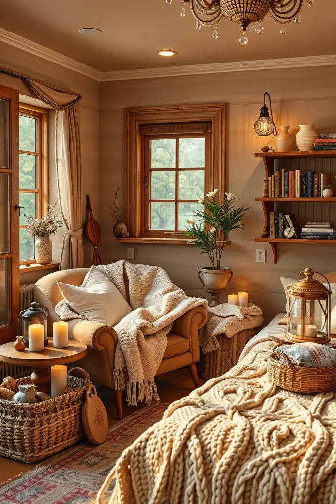 To make these nooks, I suggest adding a cozy window bench or plush armchair, along with chunky knitted throw blankets, woven baskets, and a small collection of popular books. To finish the add a small side table with a candle or two, preferably soy or beeswax candles with warm scents like amber or cedar. The cozy nook is completed with warm string lights or lanterns.