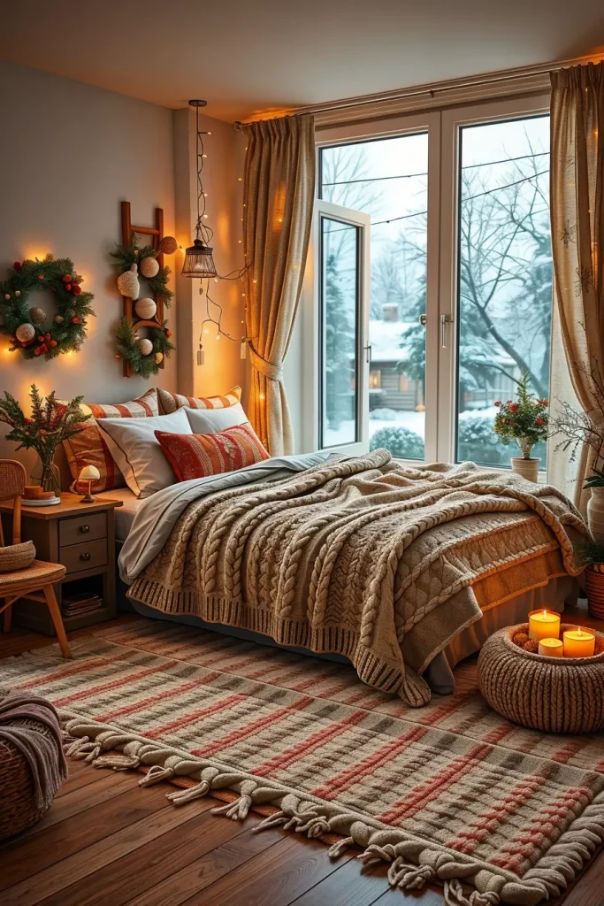 During winter, I replace summer rugs with thicker wool ones, put in place flannel bedding, and put up thermal curtains to insulate the area. To add more warmth to the space, I incorporate mood lighting and fairy lights. Scented candles in cinnamon vanilla, and pine also add to the warm winter feeling.