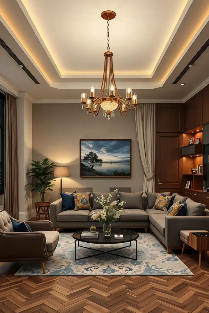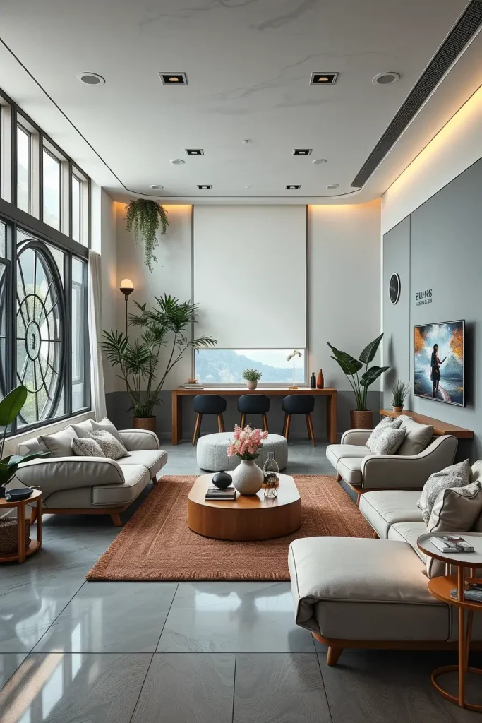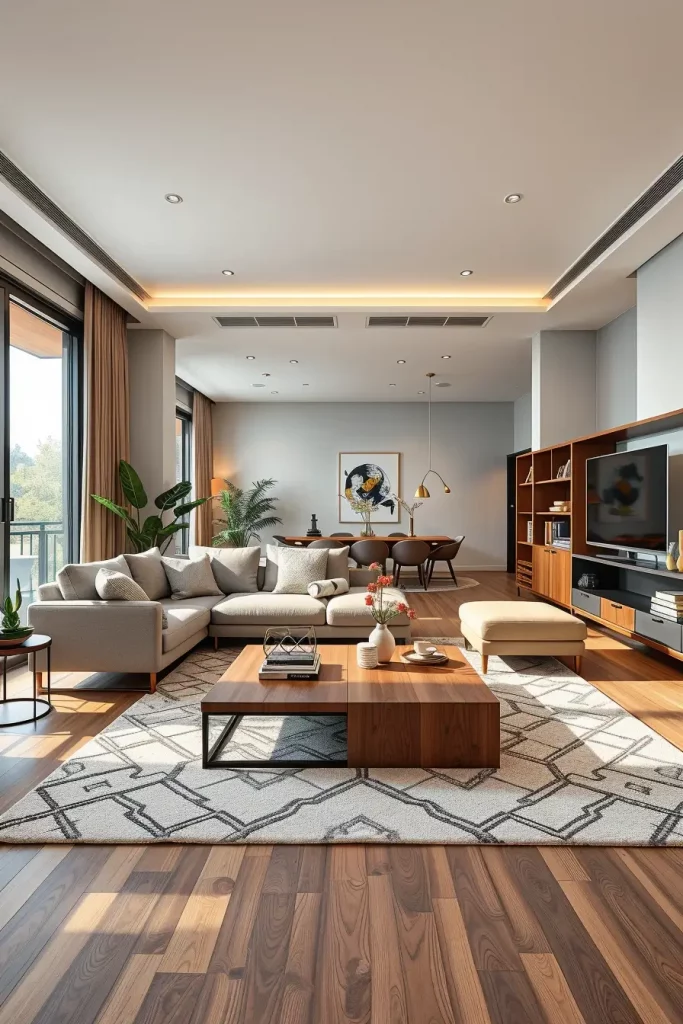Personally, modular furniture, built-in shelving, and smooth sofas with concealed storage are the most significant aspects to me. Another suggestion I would make is to select a media console that has in-built smart charging facilities so as to minimize clutter. There will be low-profile coffee tables that will be accompanied by statement rugs to provide balance to the open layout.