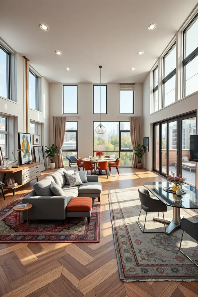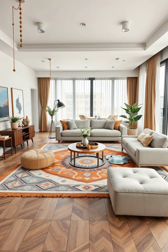 I usually choose the rugs that fit the general style, a geometric pattern to match the modern apartments, or a soft neutral carpet with a slight texture to match minimalist interiors. It is also possible to add some interest by layering smaller rugs, particularly when dealing with small layouts. I will suggest using coffee tables or poufs along with rugs to have a unified appearance.