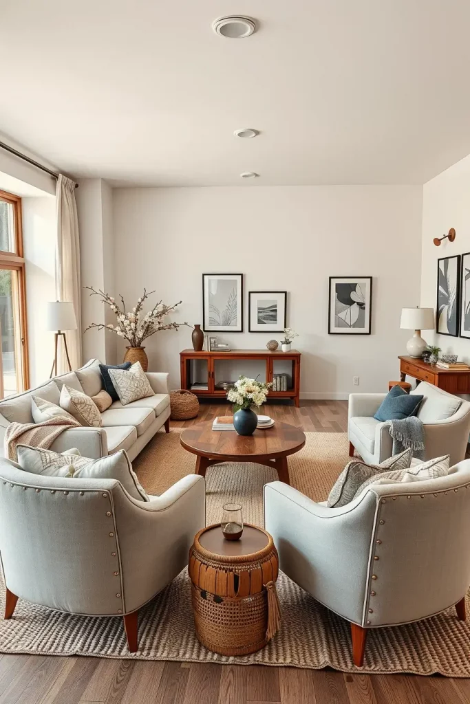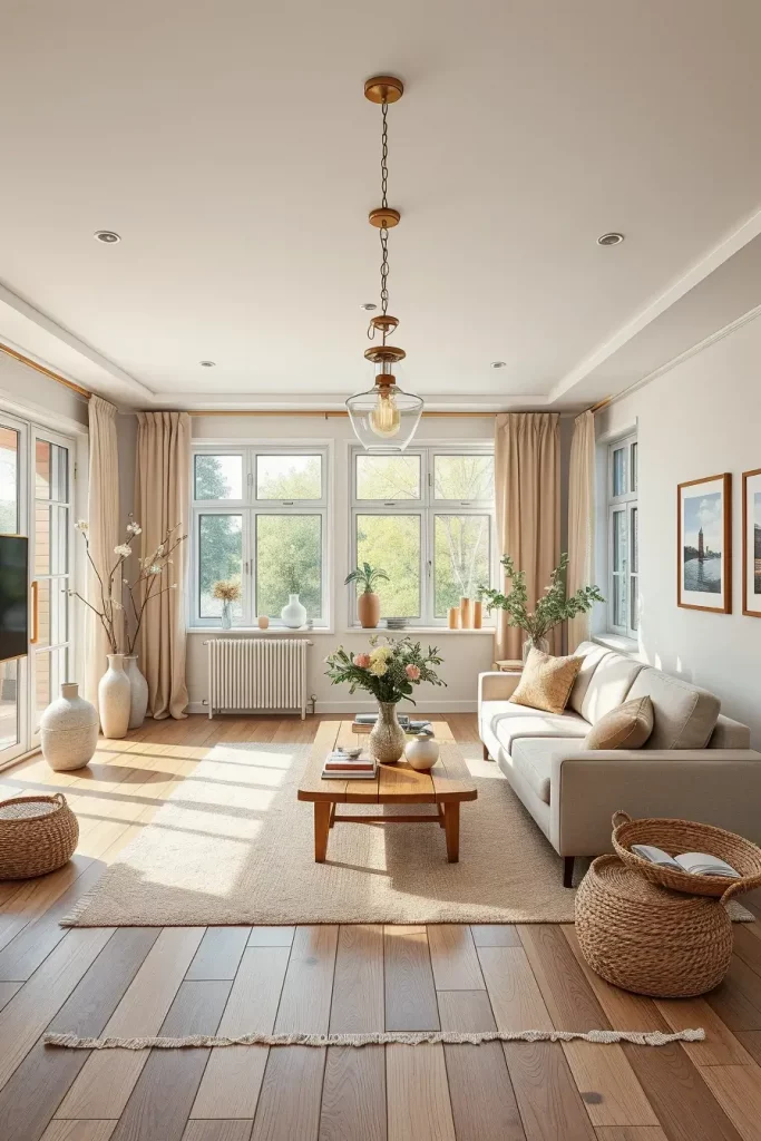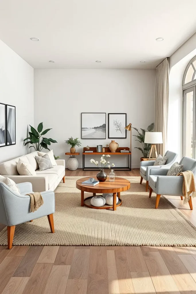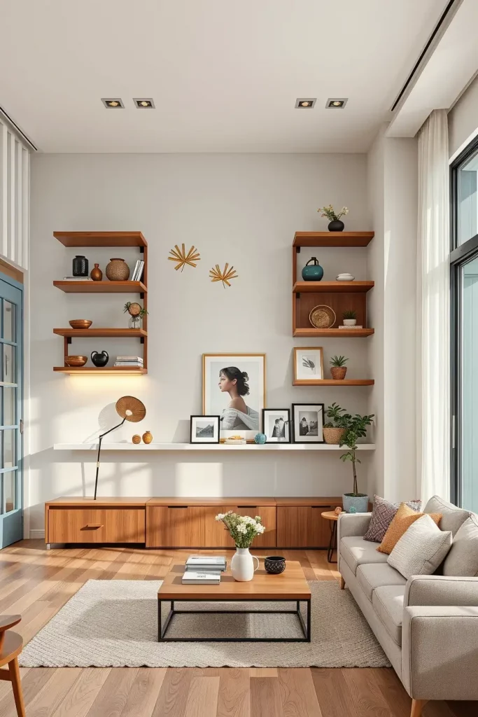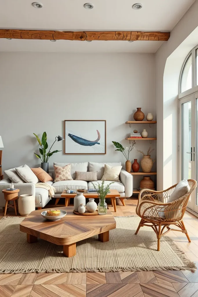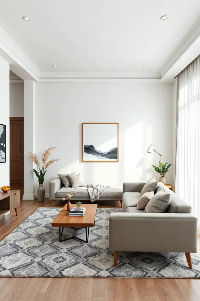 In my layouts, neutral walls are applied with light grays or cream sofas. Wooden coffee tables and sparse shelving provide detail. In terms of texture, I suggest the use of woven carpets, cotton throws, and wood finishes made of natural wood.