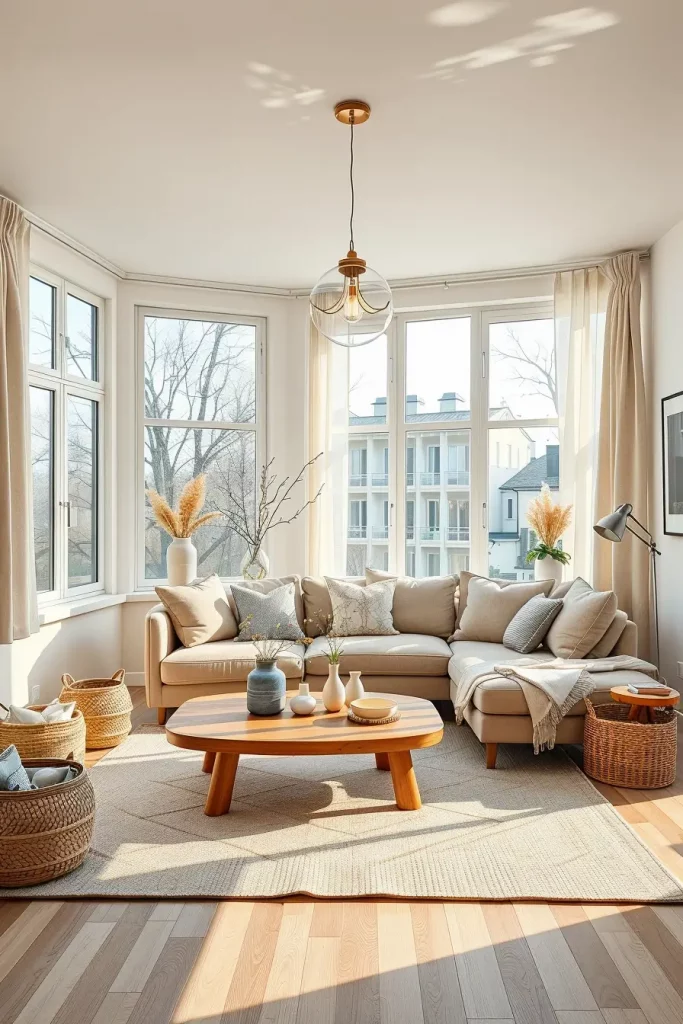 I would incorporate a light sectional sofa, plain wooden coffee table and plainly colored carpets. It is also a great idea to add a combination of practical shelves and minimalistic decoration items such as ceramic vases or woven baskets to underline simplicity. The overall appearance is completed by pendant lighting that has a soft glow.