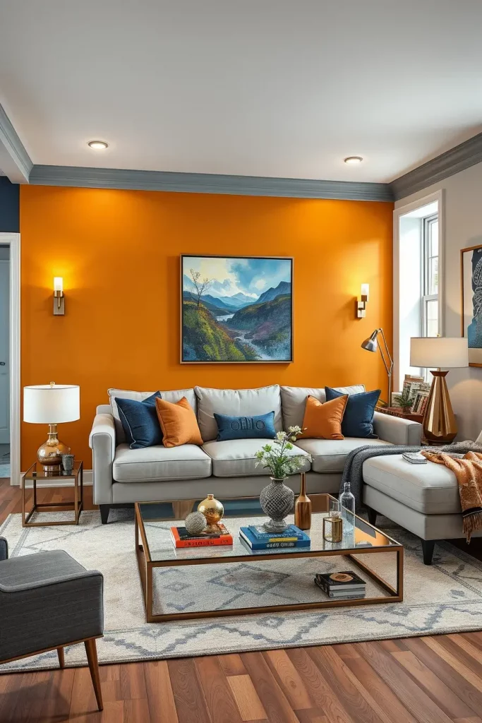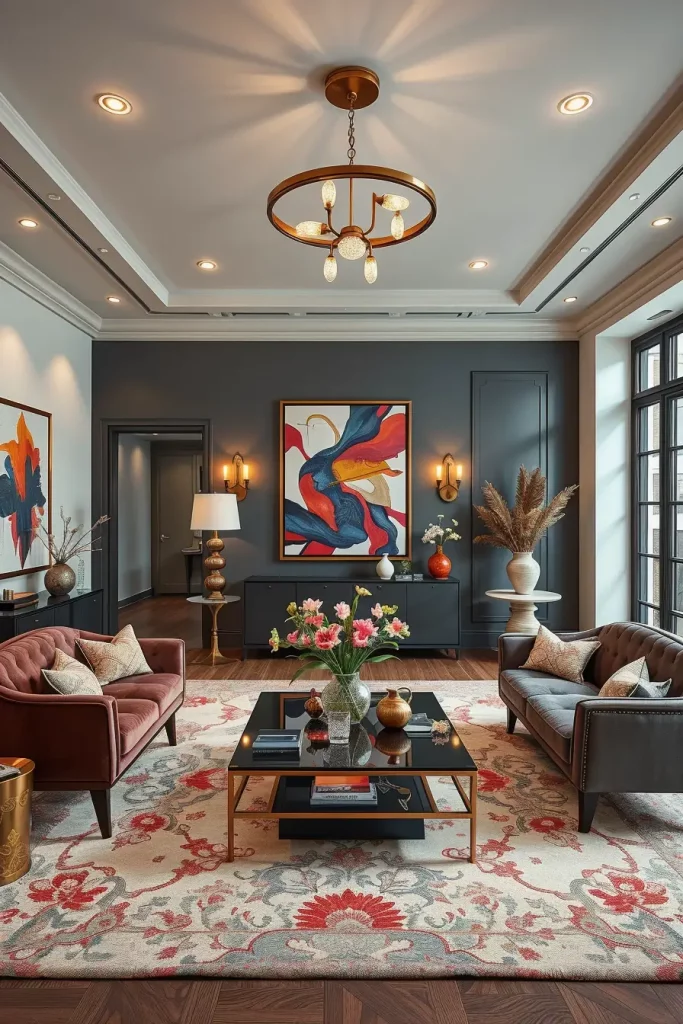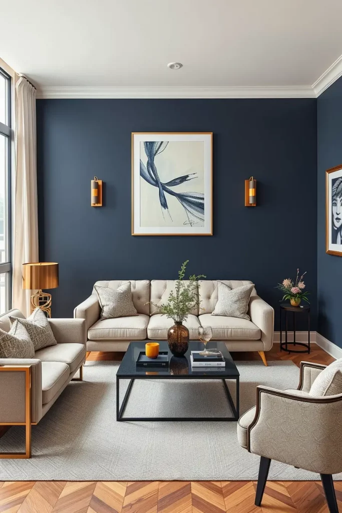 I would usually advise to combine bold walls and simple furniture: a neutral couch, a smooth coffee table and clean shelves. The metallic lamps or glass accessories added would balance the intensity of the wall.