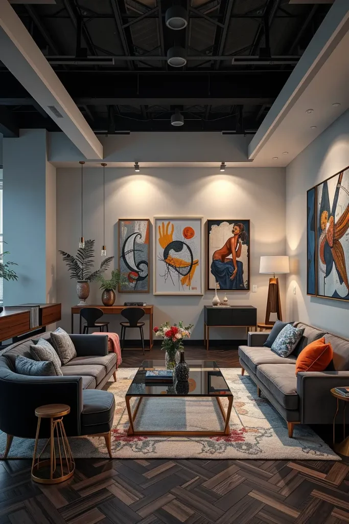 Furniture and decor normally follow the selected wall art. An aggressive mural can be combined with a plain sofa, and rough panels can be matched with smooth metal or glass tables. I would suggest that other elements should be kept minimal in order to have the wall decor as the center of the design.