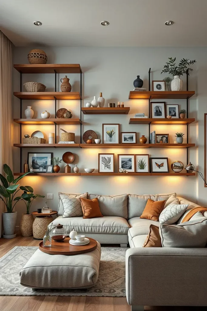 The shelving can be floating wooden boards, simple metal frames or even glass to make it look lighter. I suggest having a combination of decorative and practical objects, e.g. combining woven baskets to store things with ceramics or photo frames to be stylish. Shelf lights can be integrated with LED lights that can illuminate objects and provide the space with a modern appearance.