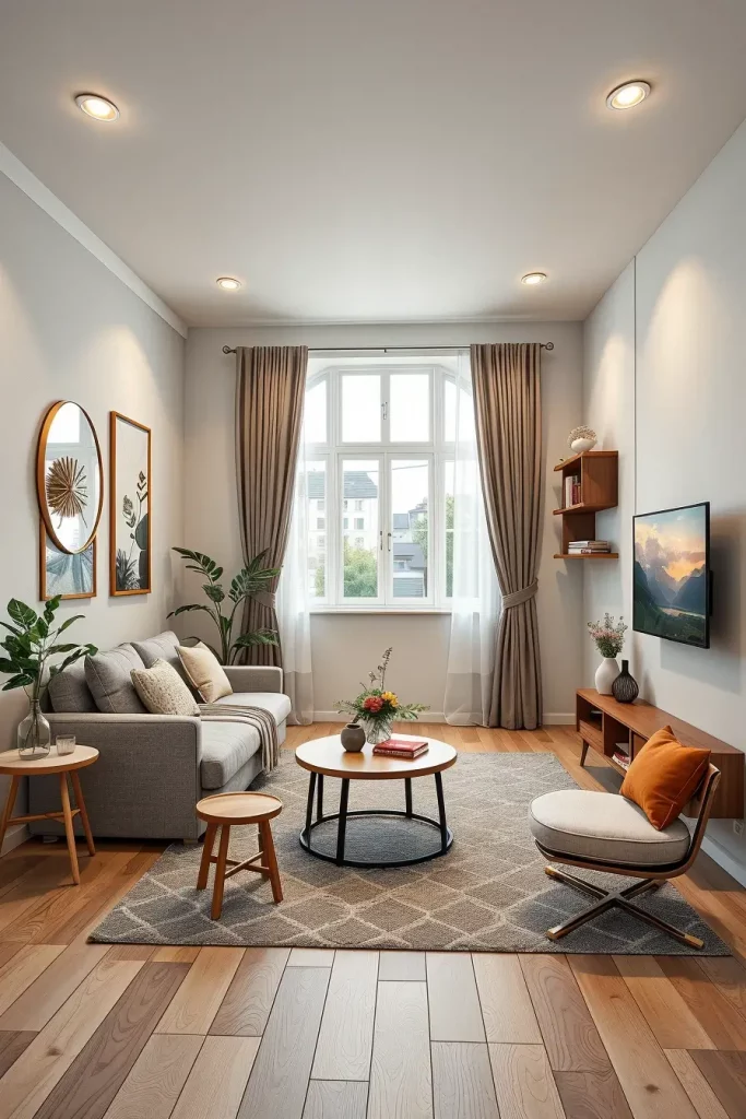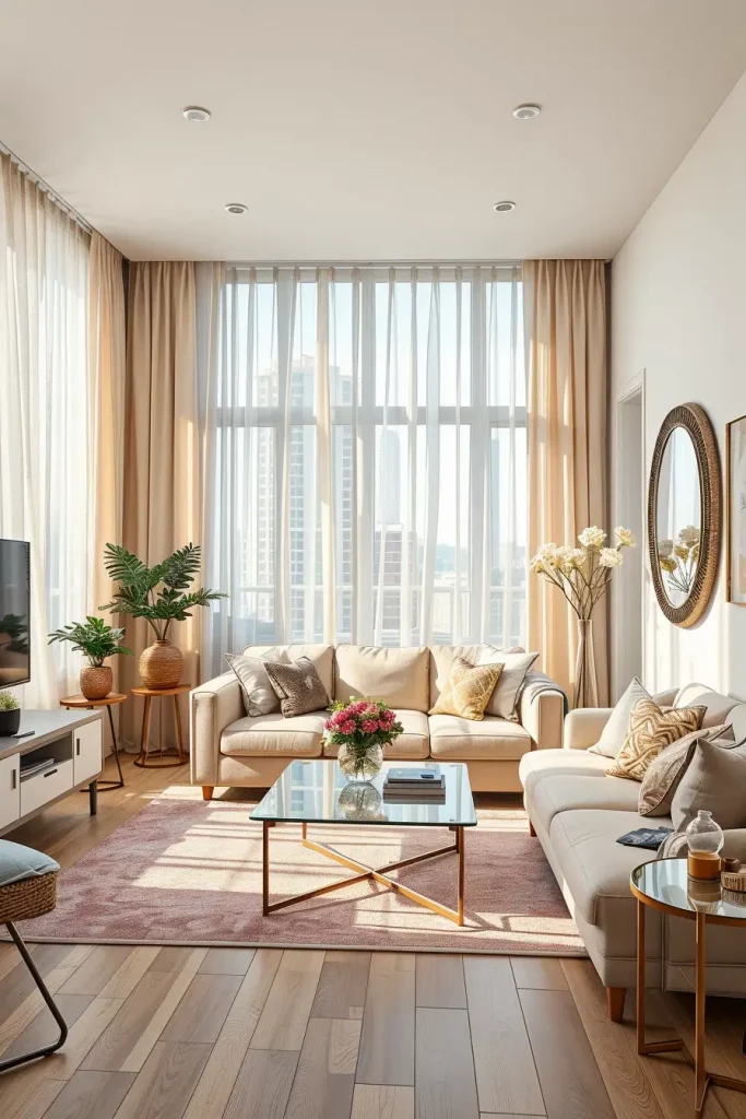Personally, I consider natural light as one of the key features of apartment living room designs in 2026. A bright environment will be perceived as more welcoming, but it will also be healthier and bigger. I usually recommend as much exposure to the window as possible and reflective surfaces to help even out the light in the room. Mirrors strategically placed in apartments that do not get direct sunlight can be of immense help.