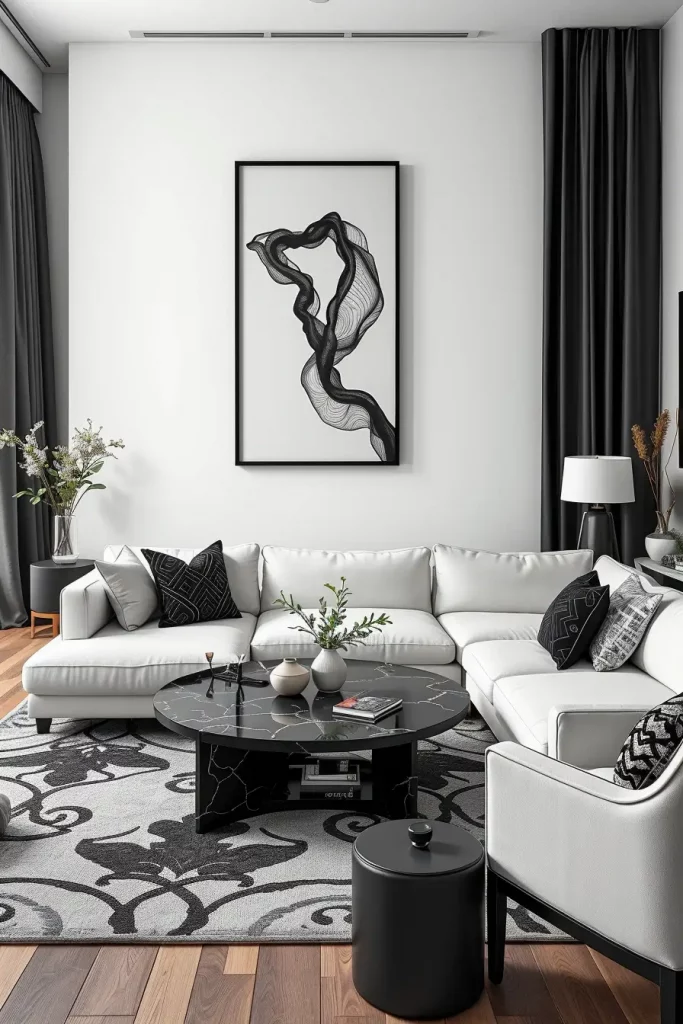 The furniture is typically smooth black with white upholstery. Imagine a white sectional and a black marble coffee table or black framed shelving. Black and white art or patterned throw pillows are a minor detail. I tend to suggest the use of soft lighting to ensure that the scheme is not too harsh.