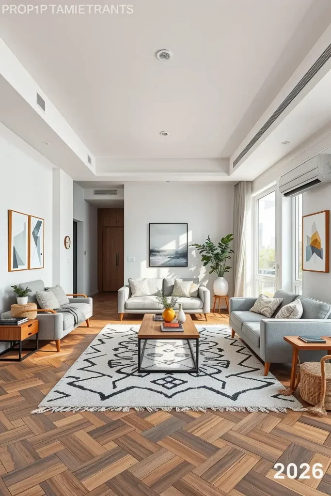The accent rugs are the focus of most of the designs of the living rooms of apartments as they provide a definition of spaces and add color, pattern and warmth to a room. I would suggest the use of rugs as decor and practical dividers in open-plan apartments in 2026. An appropriately placed rug can divide a sitting space with a dining or working space.