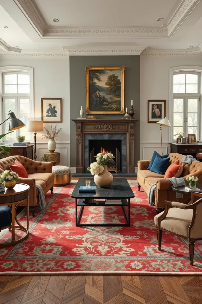 In the case of furniture, I would have a Chesterfield-style sofa with a modern coffee table or antique side tables with a modern rug. This produces contrast without conflicting. Textiles like velvet cushions or wool throws add warmth and modernized lighting (such as slender floor lamps or simple chandeliers) ensure that the room does not feel too heavy. The neutral colors with occasional jewel-coloured accents are also suitable here, and they bring the harmony between old and new.