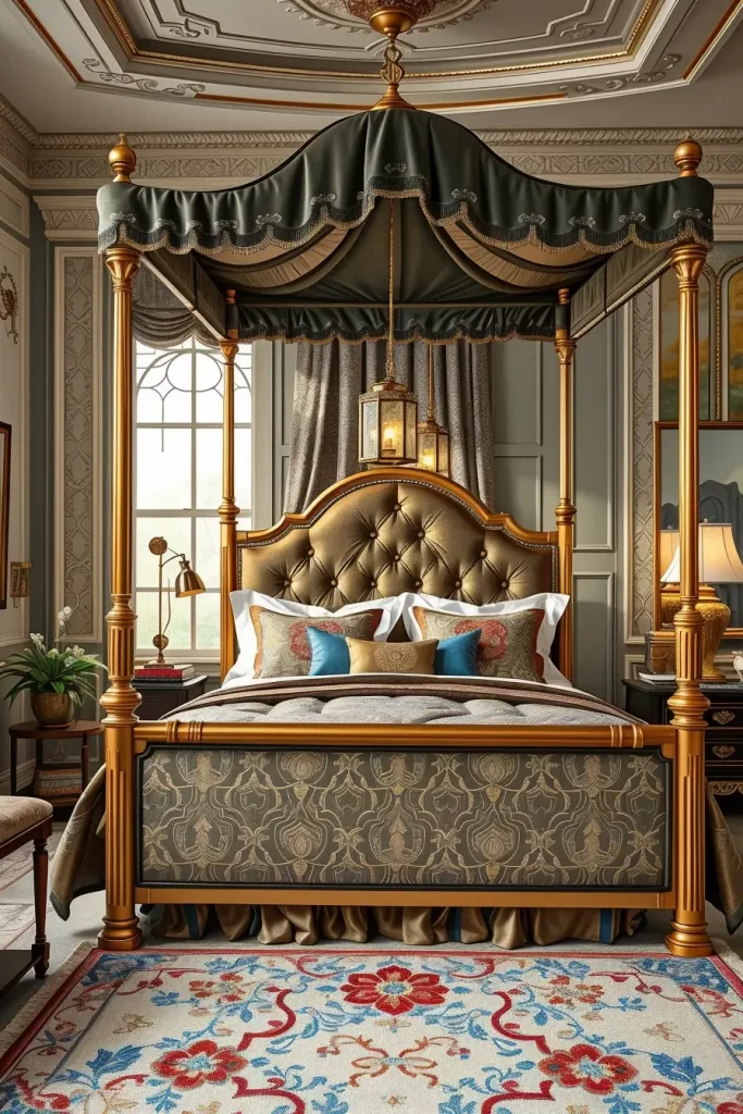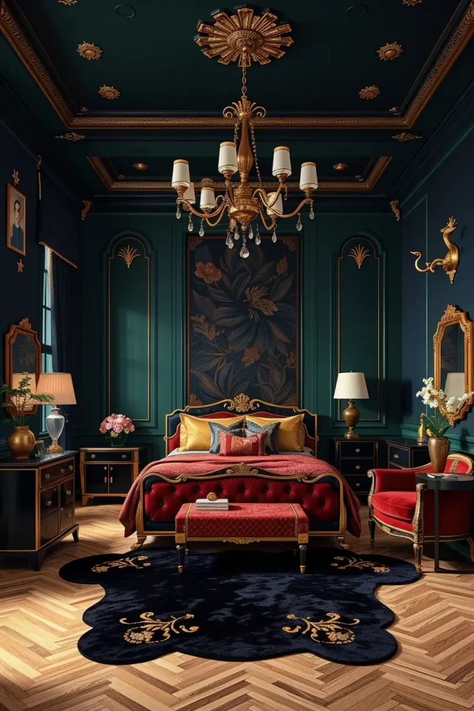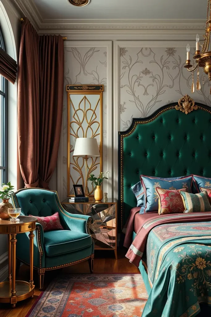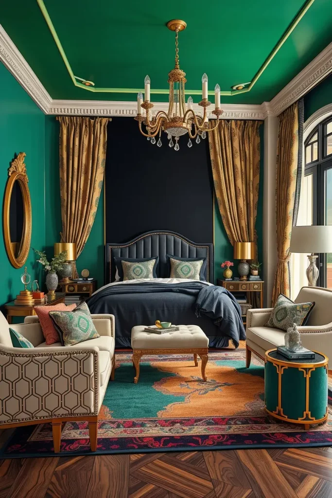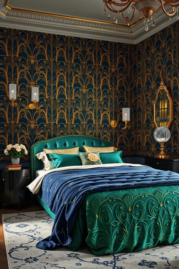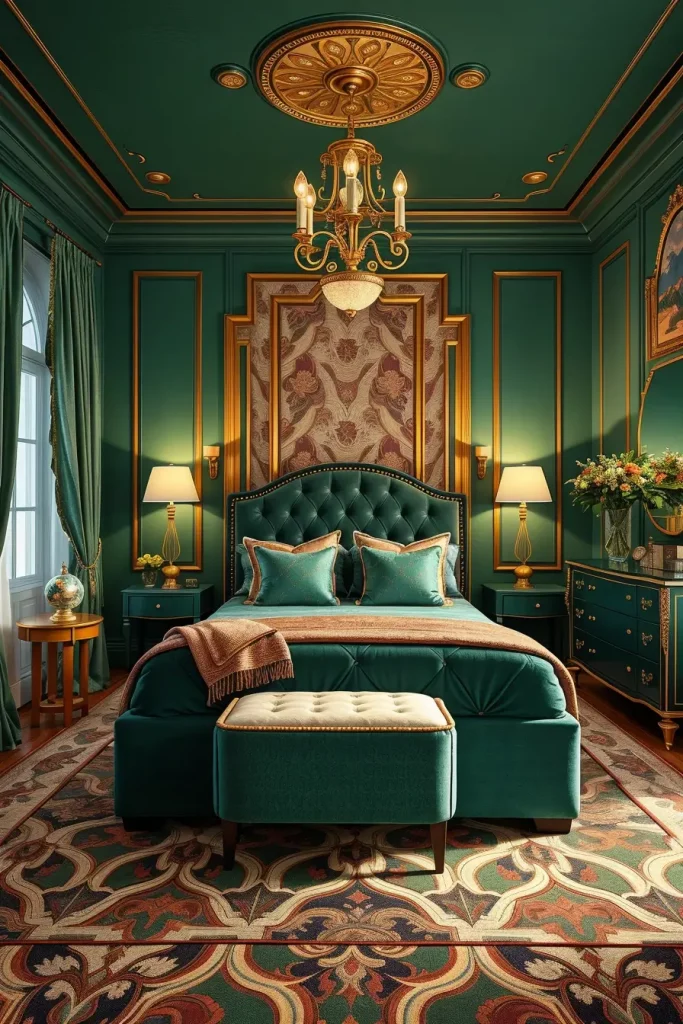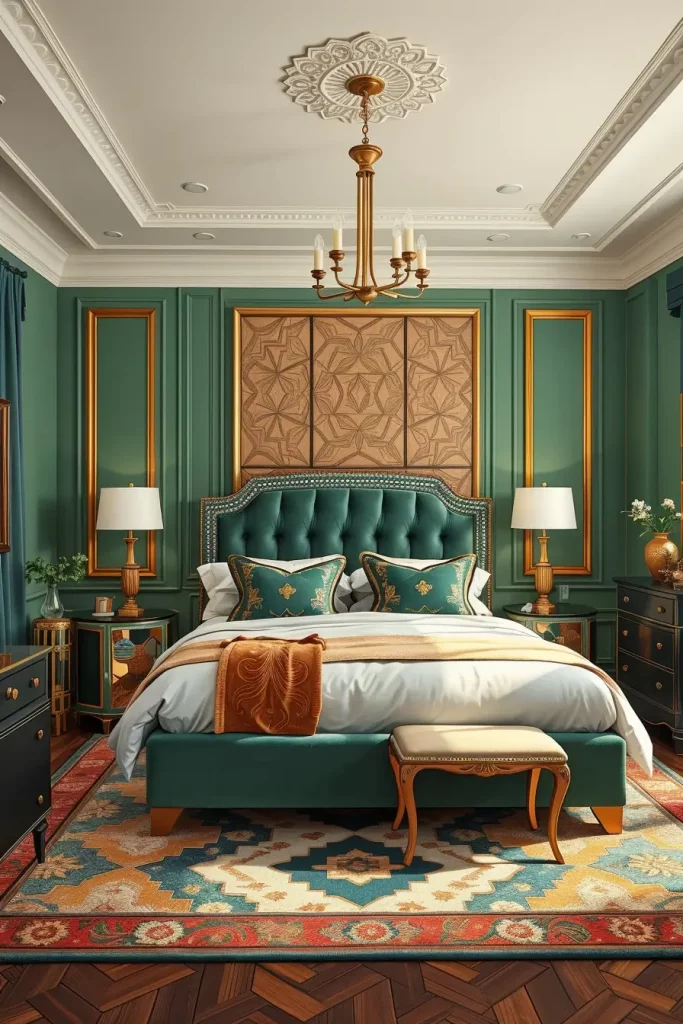 Defining the color palette for an Art Deco Revival bedroom entails selecting bold colors, I tend to choose the deep shades of emerald green and navy alongside burgundy and then gold. These shades suggest lavishness while also maintaining a cozy and lively environment.