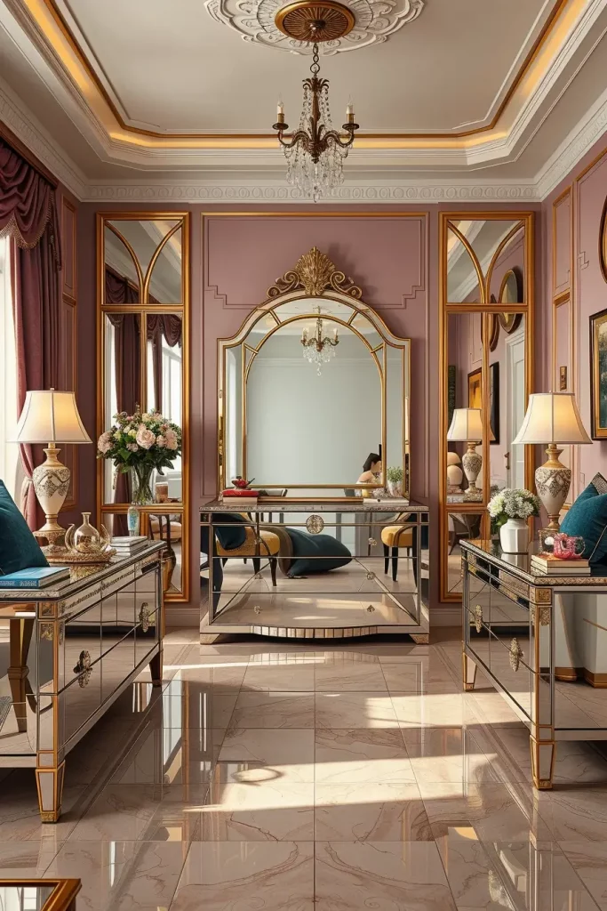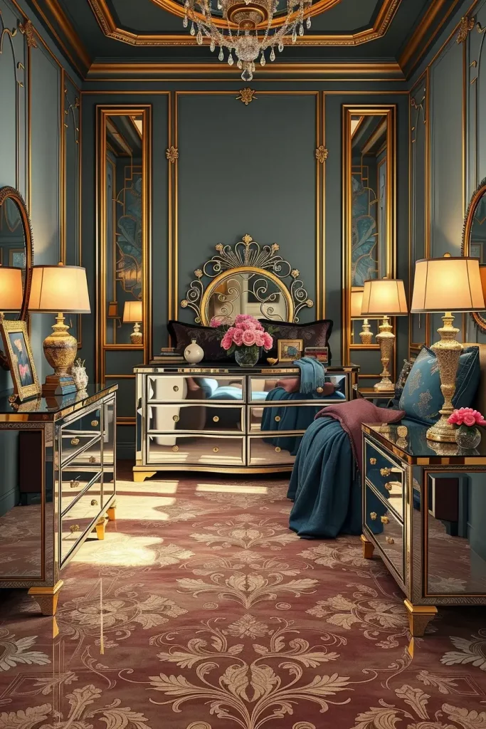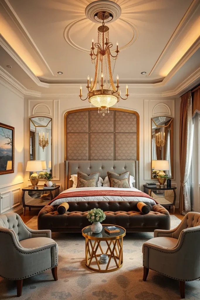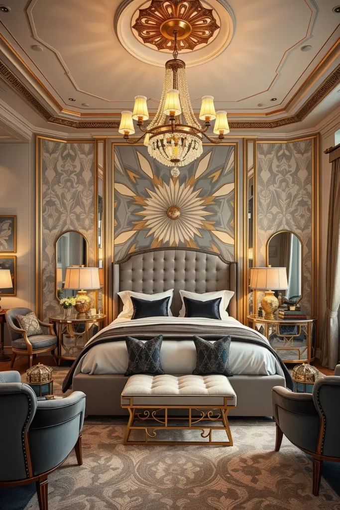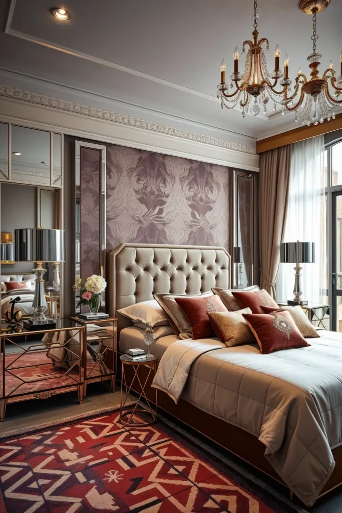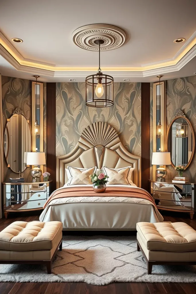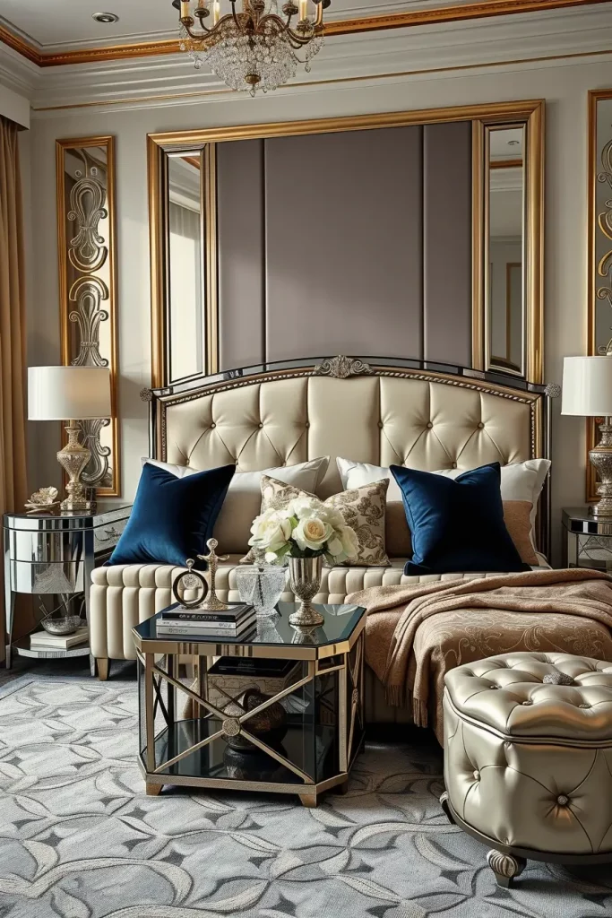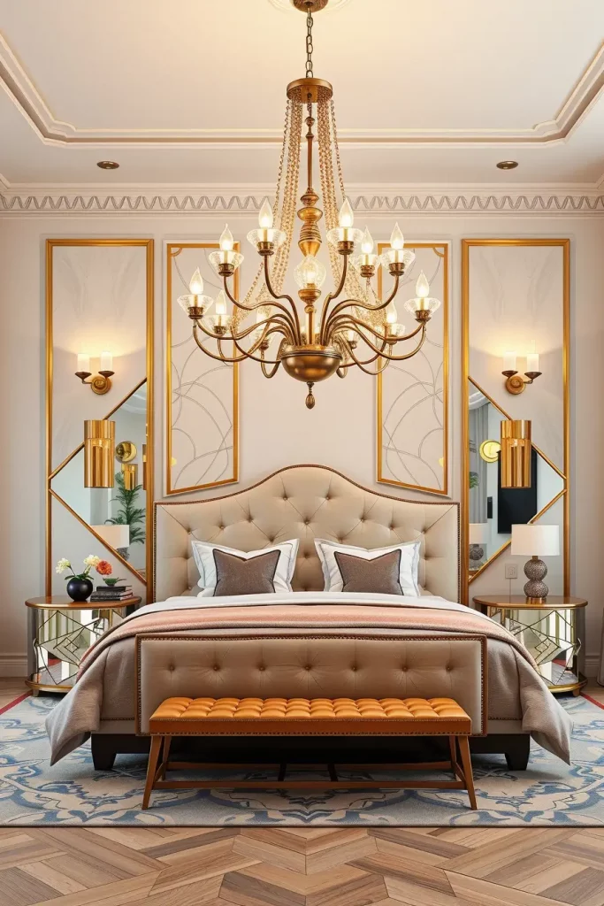 When it comes to furniture, I feel the geometric chandelier paired with mirrored nightstands and velvet seating enhances the Deco atmosphere. The light bounces off the reflective surfaces and creates an inviting glow that makes the entire room feel luxurious.