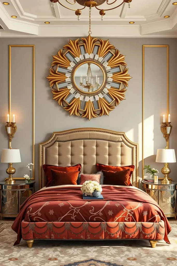 Mirrors are an integral part of any Art Deco Revival bedroom with any ordinary mirror, the framing is what elevates a mirror to a focal point of the room. When it comes to choosing mirrors, I always advise clients to go for oversized mirrors with audacious frames such as beveled edges, sunburst shapes, or geometric detailing, as these immediately grab the attention of the wall.