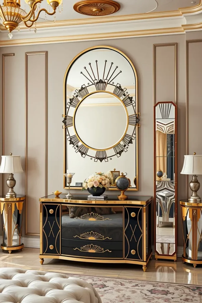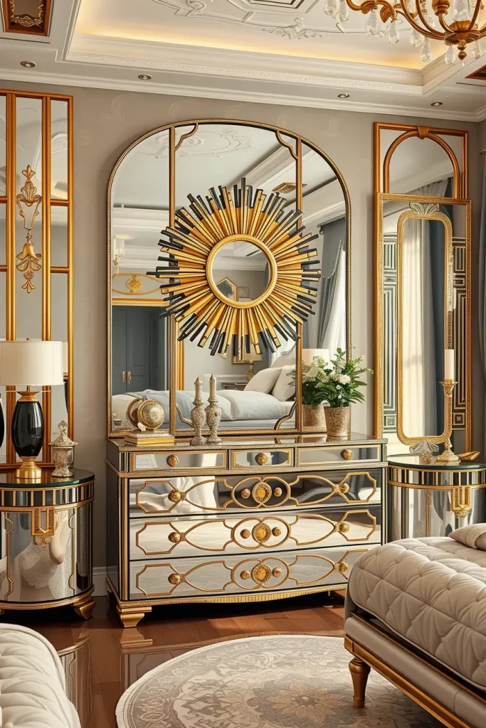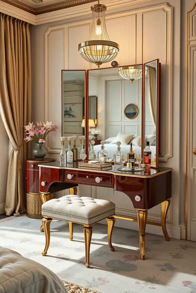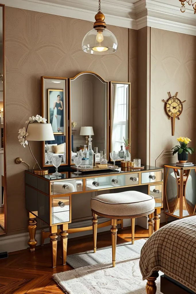 To achieve the authentic Deco look, I suggest a mirrored dressing table with slim brass legs and crystal knobs, along with a three-panel mirror. To elevate the design, I recommend adding accessories like sculptural lamps, glass trays, and perfume bottles which adds visual interest to the entire composition.