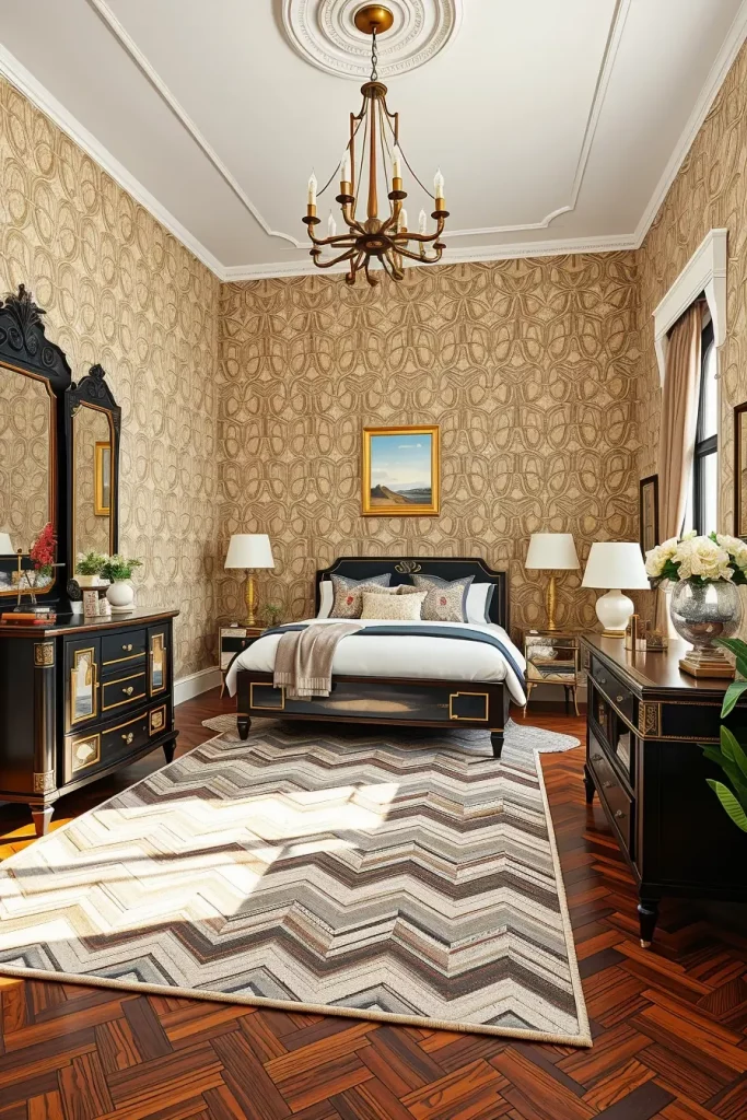 I personally find rugs to be one of the best approaches to test out Art Deco patterns without making any permanent adjustments. Elle Decor suggests that bold rugs should be used as focal points in bedrooms, and I can personally attest to the effectiveness of this approach.