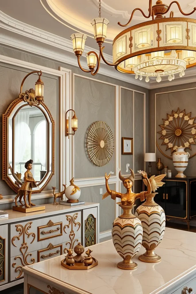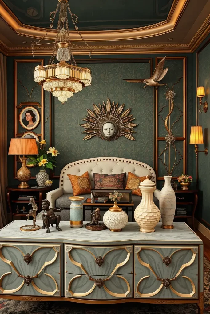 Every Art Deco Revival bedroom lacking sculptural decor feels unfinished. I personally like to fill the space using decorative sculptures, bold vase pottery, or pieces of art that showcase eye-catching geometry. These accessories give the room more attitude and character, taking it from stylish to unforgettable.