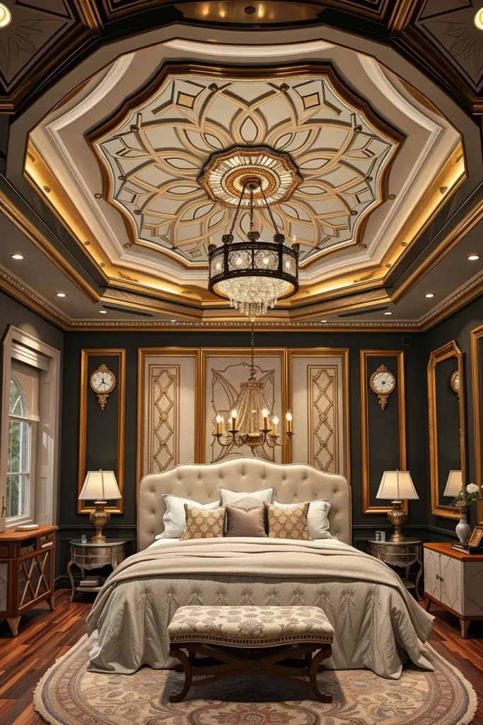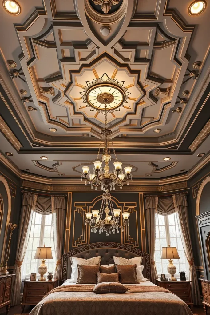 Ceilings might be left until last, but in a Art Deco Revival bedroom, they can be a source of dramatic emphasis. I have geometric mouldings, layered ceiling trays, and decorative plasterwork where I try to mimic Deco architectural ideas. These details draw the eye and add emphasis to the room.