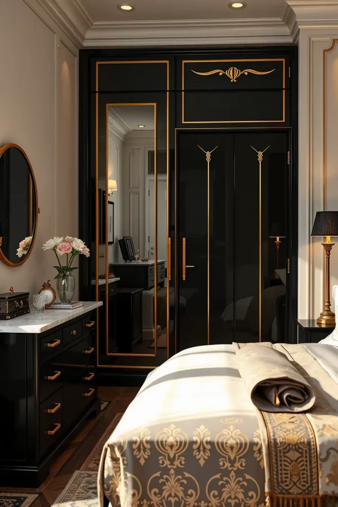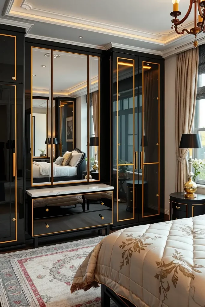 Built-in wardrobes with gold trim or glossy black lacquer can serve both storage and a design element. Low dressers with marble tops and brass pulls bring a functional sophistication.