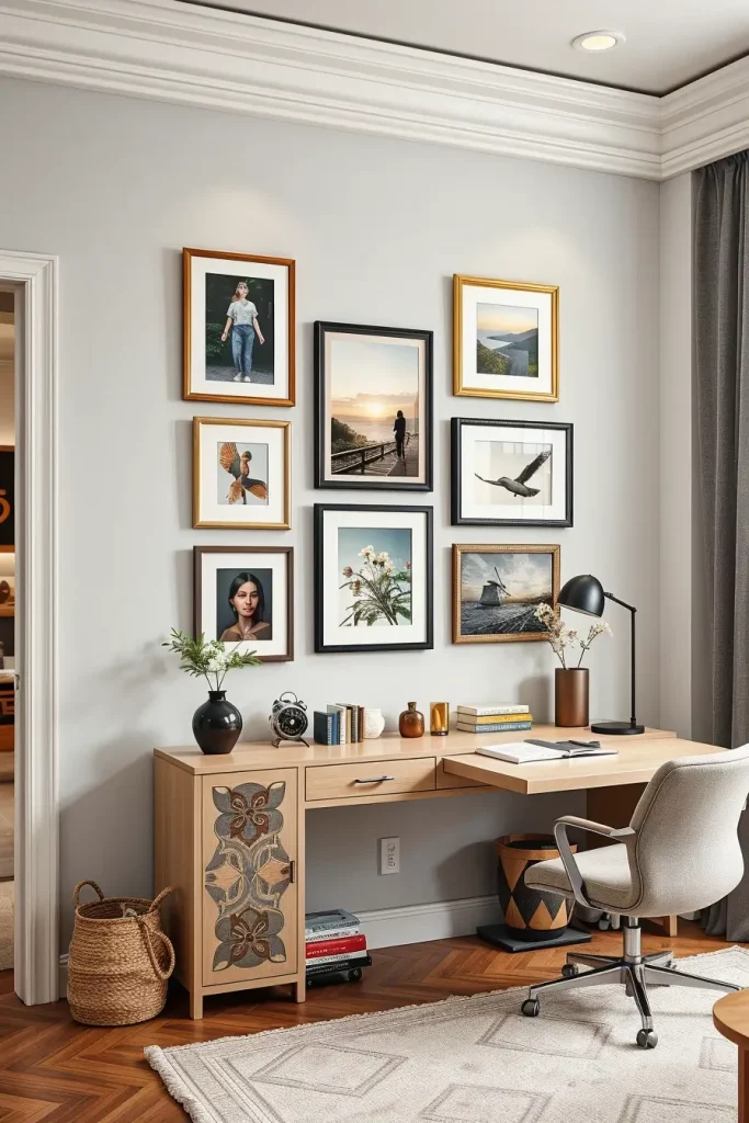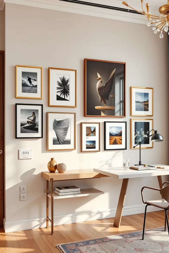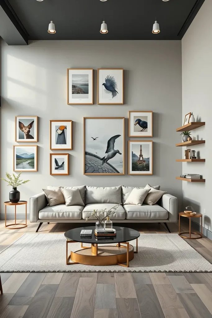 I normally recommend using a key piece in the middle and surround it with smaller pieces of art or photographs. The complementary furniture like console tables or bookshelves under the gallery wall increases functionality The arrangement is deepened by small accessories such as candles or ceramics.