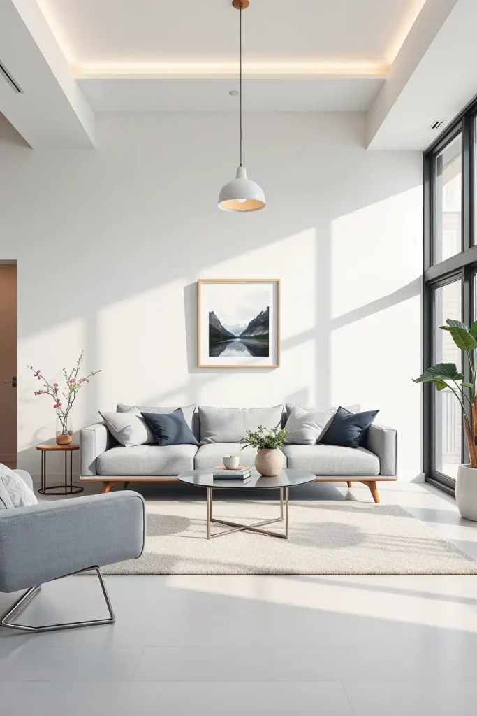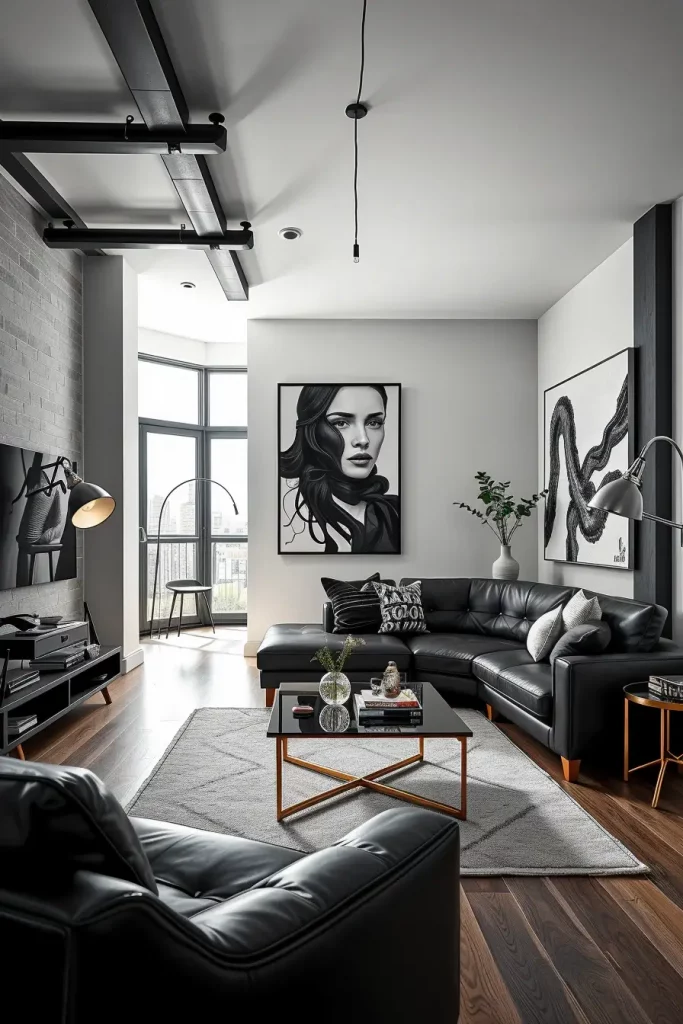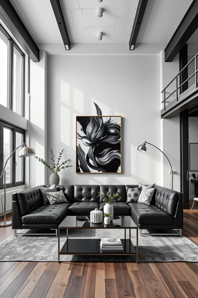 I like minimalist furniture, like black leather sofas, glass coffee tables, or matte sideboards. The monochrome scheme is enhanced with metallic accents such as chrome floor lamps or silver-framed mirrors that do not interfere with the balance of the scheme.