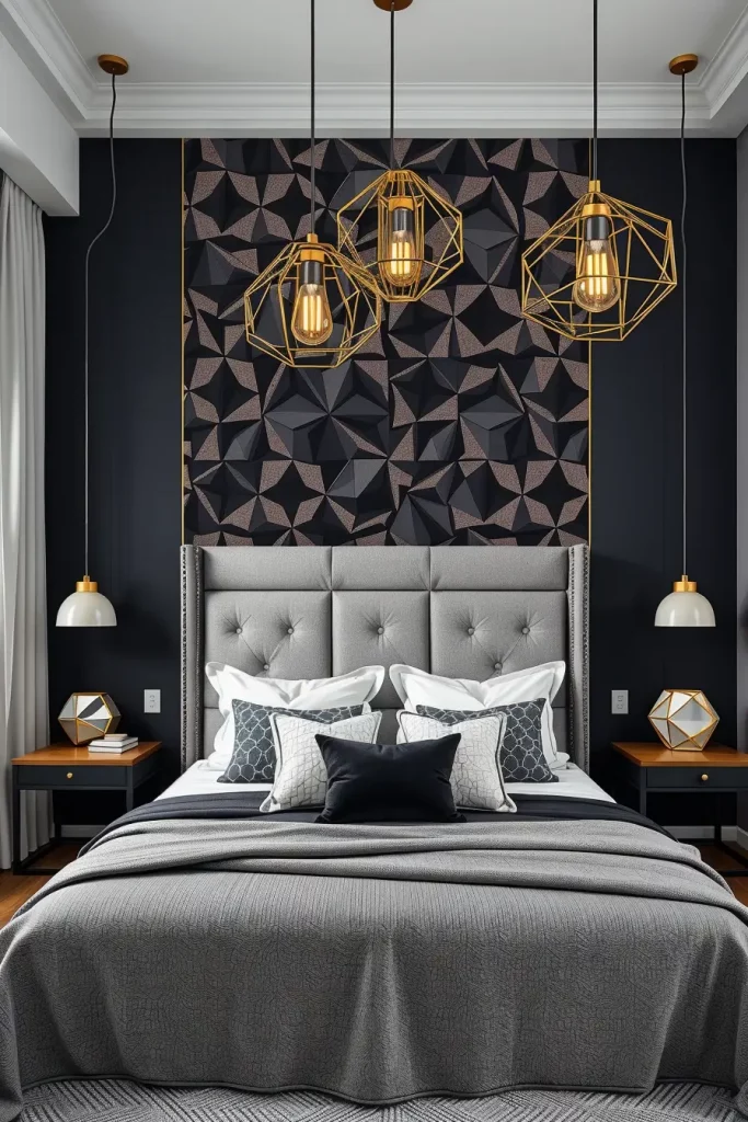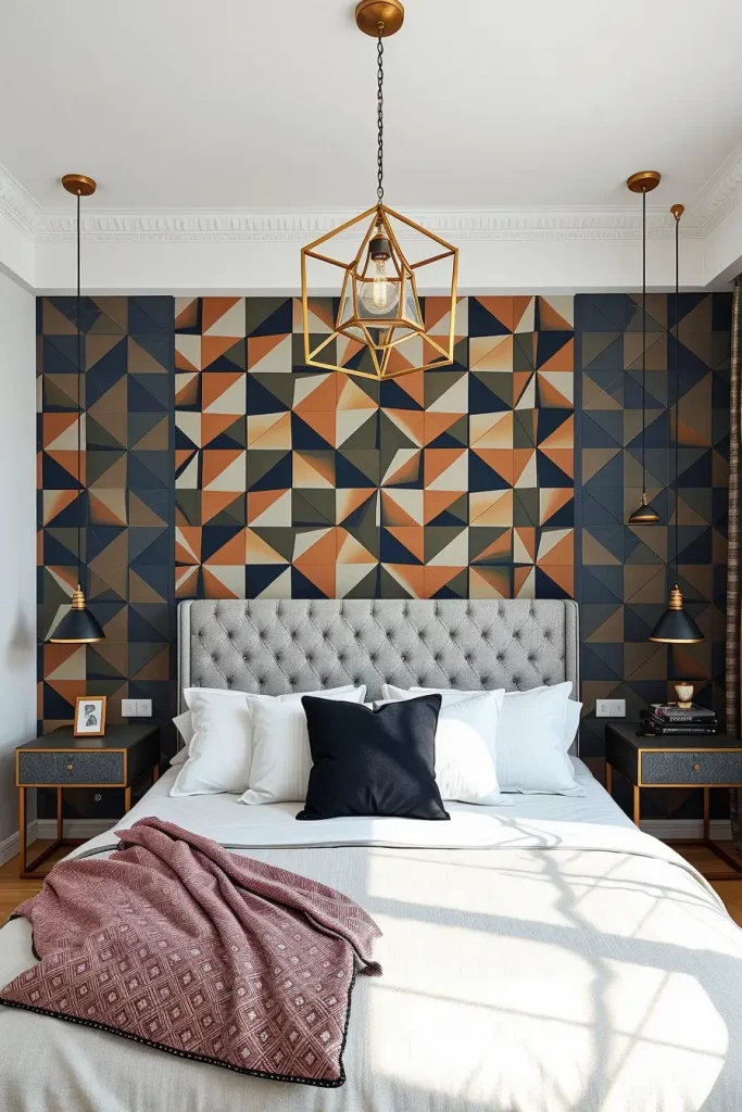 To counter-balance geometric walls, I mix them with solid furniture items like upholstered headboards, square side tables, or rectangular sofas. The accessories such as monochrome cushions, patterned rugs, or geometric lighting fixtures repeat the patterns on the walls creating a visual harmony in the room.