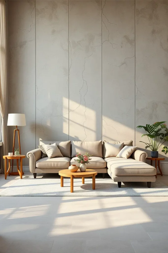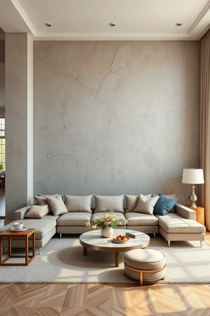 The furniture must be kept to a minimum when textured walls are the focus of attention As an example, a plush sectional with a neutral color, plain wooden side tables, and plain floor lamps match perfectly. The aim is to have the wall finish do the hard work and the rest of the room to support it in the background.
