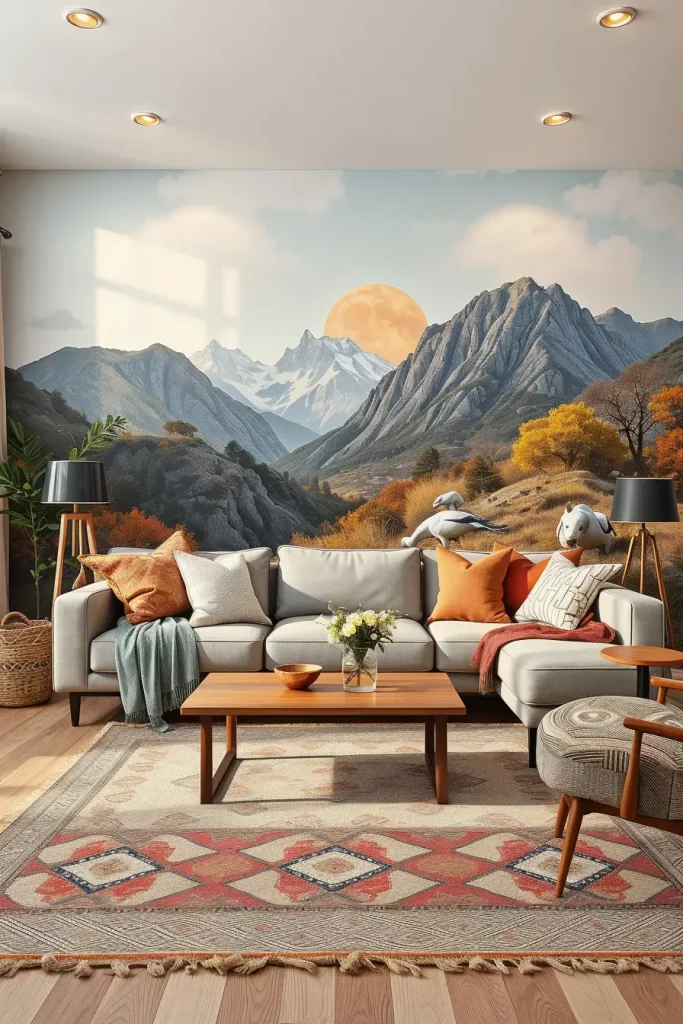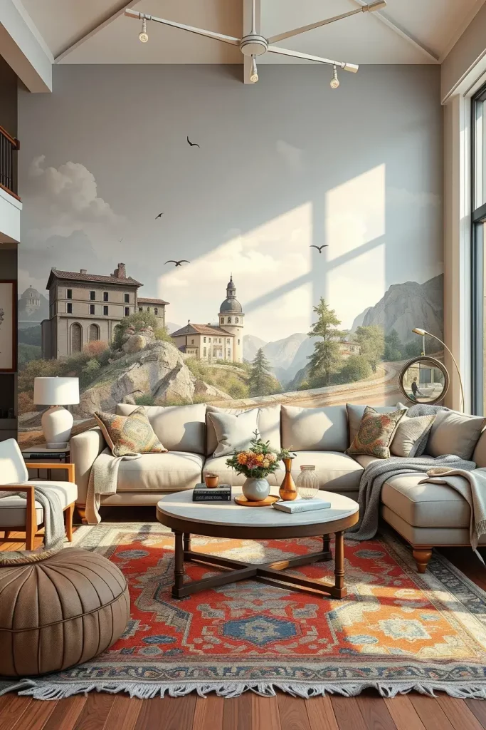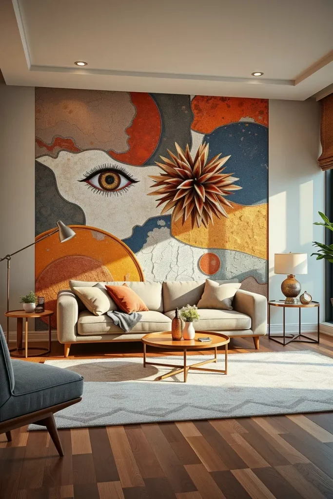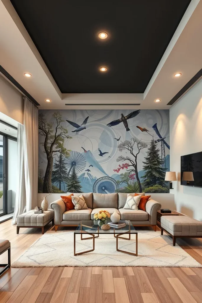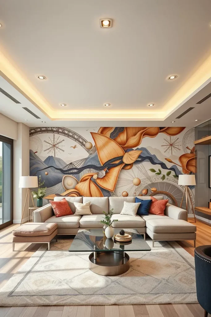 Regarding furniture, I make the other pieces around the mural simple so that the mural can be seen. The minimalist coffee tables, clean-lined sofas, and subtle lighting fixtures keep the focus where it should be, on the wall. Accessories such as monochrome cushions or small sculptures will provide balance but not distraction.