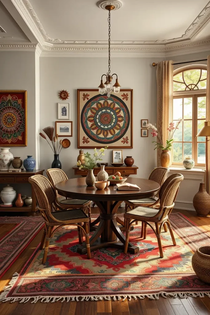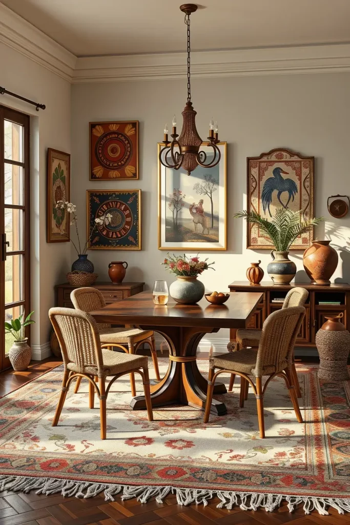 To emphasize cultural walls, I tend to suggest furniture that does not distort the theme, but does not turn into too literal. Ethnic wall art looks great with simple wooden dining table, woven chairs or handcrafted accessories. The layering of rugs or the addition of pottery adds additional authenticity.