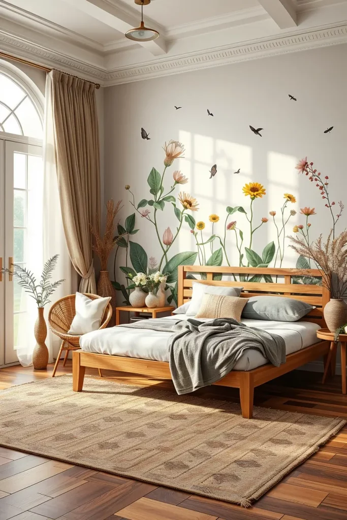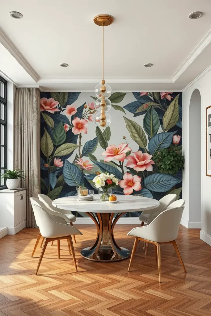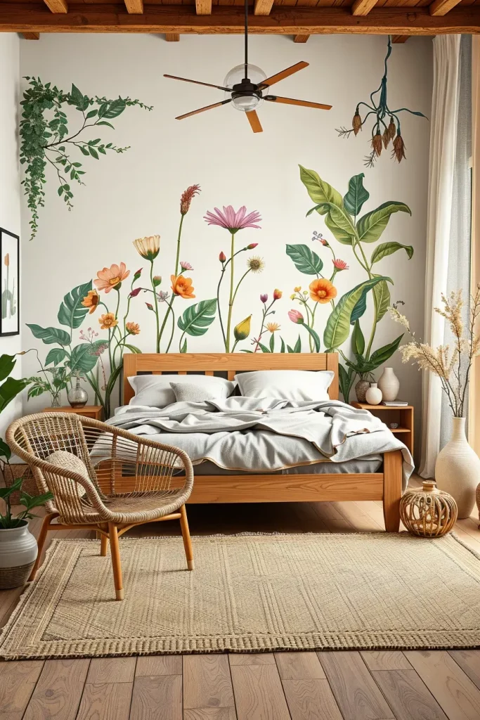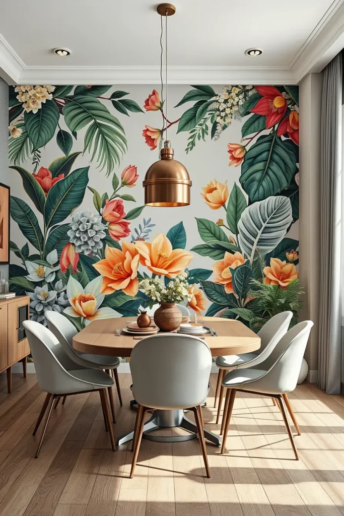 To counterbalance botanical walls, I would suggest wood furniture, rattan chairs or woven carpets. Natural accessories such as ceramic vases with greenery or linen curtains add to the natural theme. The lighting is soft, warm, and finalizes the appearance, adding to the feeling of calm.