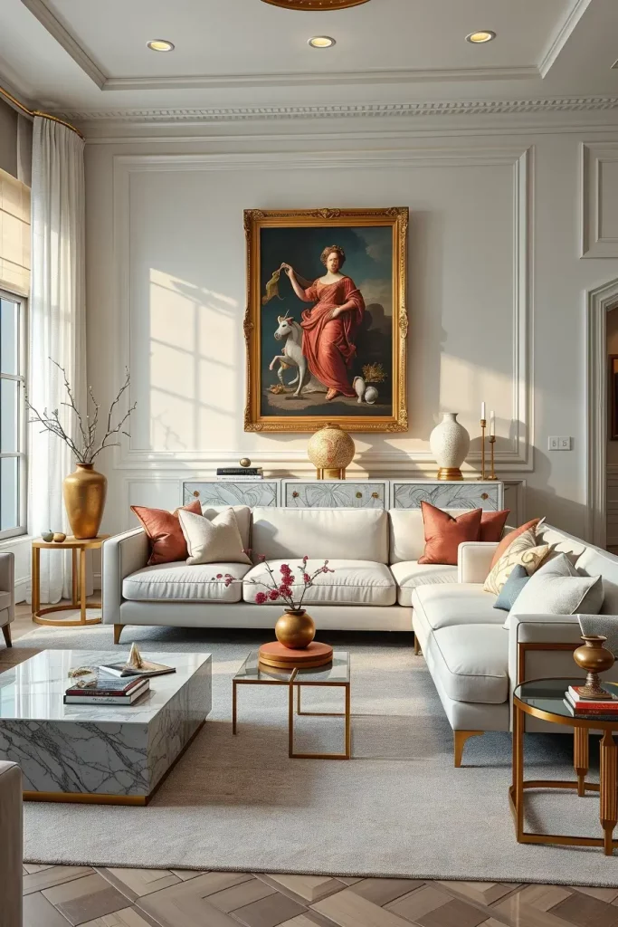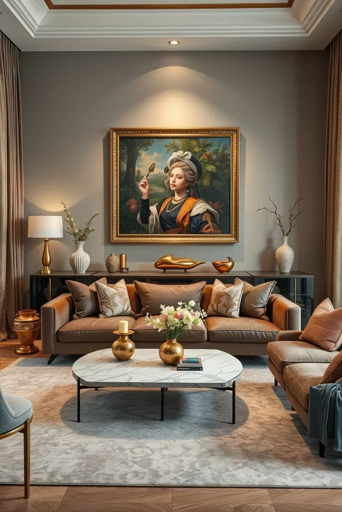 To be practical, I tend to recommend simple but classy furniture-such as velvet sofas, marble coffee tables and glass sideboards-that do not clash with the painting. Neutral backgrounds make the artwork prominent. Smaller details like gold frames or sculptural vases form small connections between the old and the new.