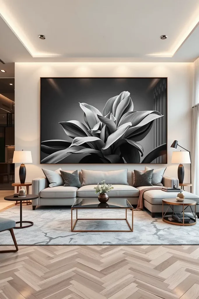 When choosing this kind of art-inspired accent, I consider all other details around it, such as minimalistic furniture, neutral-colored sofas, or accent chairs in deep textures. A big photographic work is well combined with smooth side tables, large carpets, and dimmed lighting. It adds balance and avoids the room being cluttered and it is sophisticated.