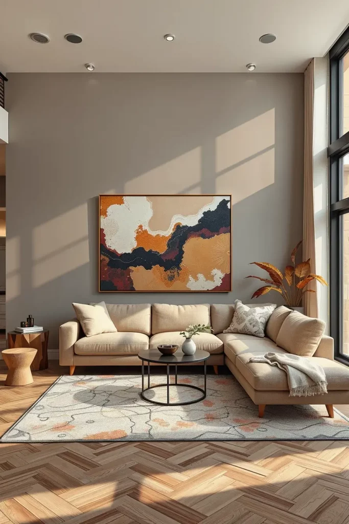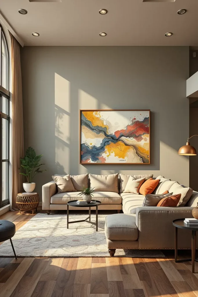 As an example, muted earth tones combined with bold abstract art is a balance without detracting the boldness of the art. In living rooms, I would suggest neutral furniture such as beige sectionals or white armchairs so that the wall color can take center stage. To complete the look, a textured rug or patterned throw pillows can be added, which will not compete with the primary artistic wall.