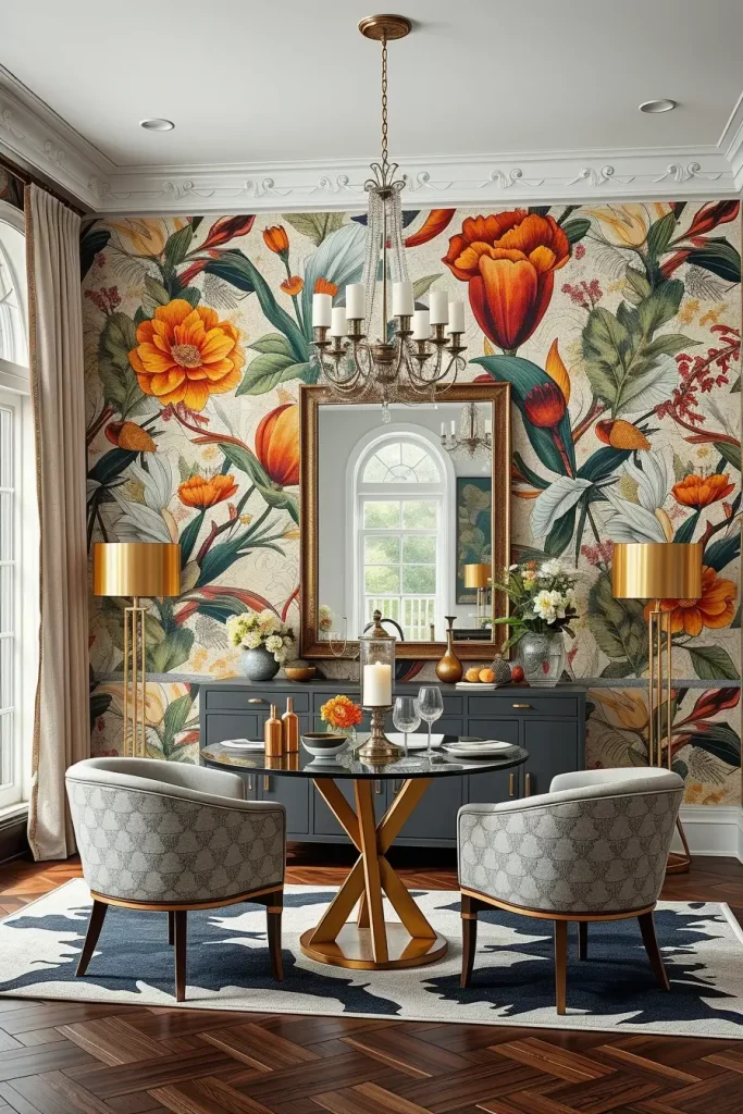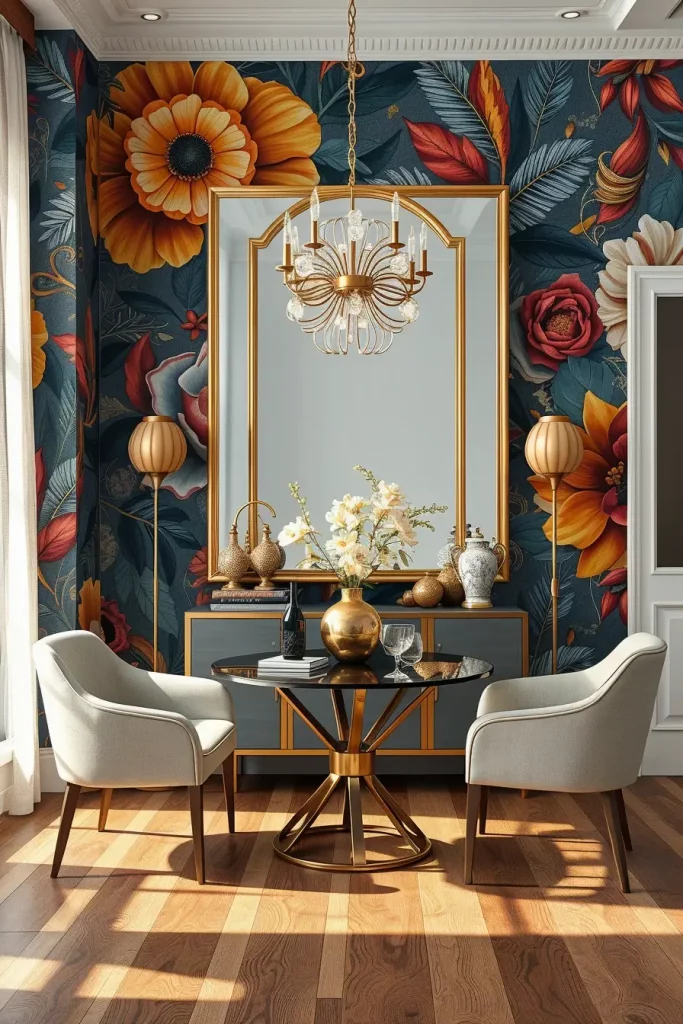 I usually combine wallpapers with plain furniture, e.g. upholstered chairs in neutral shades or modern console tables. This makes the design to stand out without straining the eye. Placing mirrors or metallic floor lamps around the area will add to the aesthetic value and develop the textures.