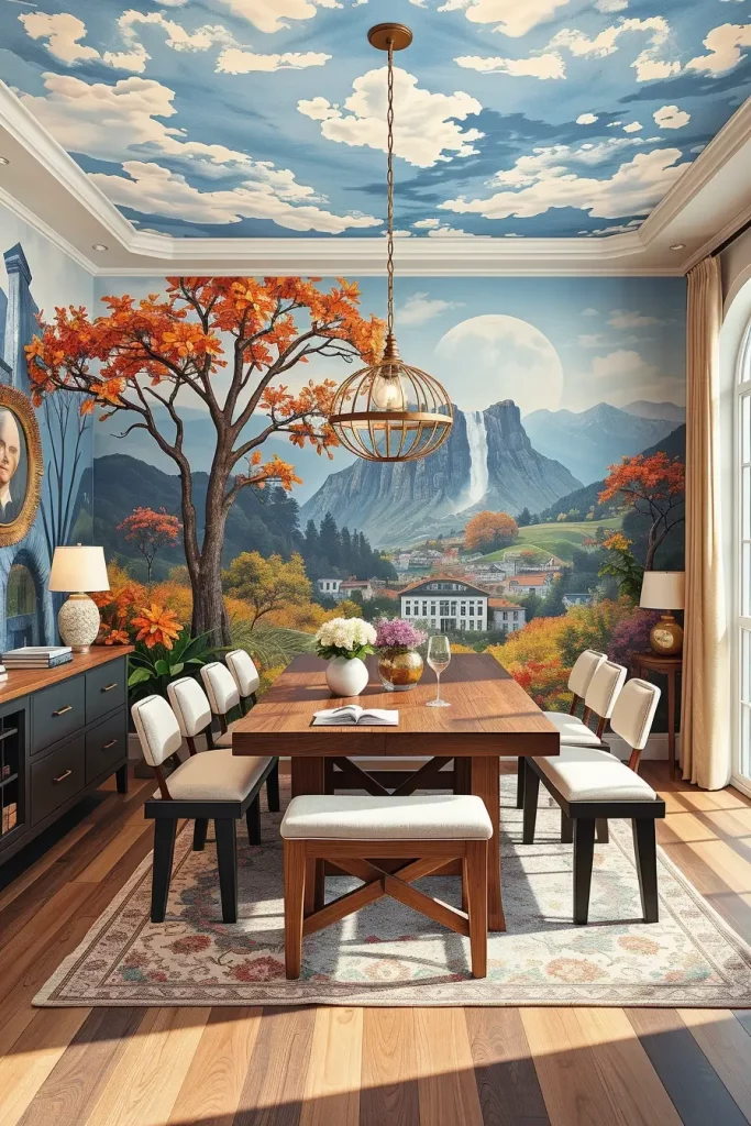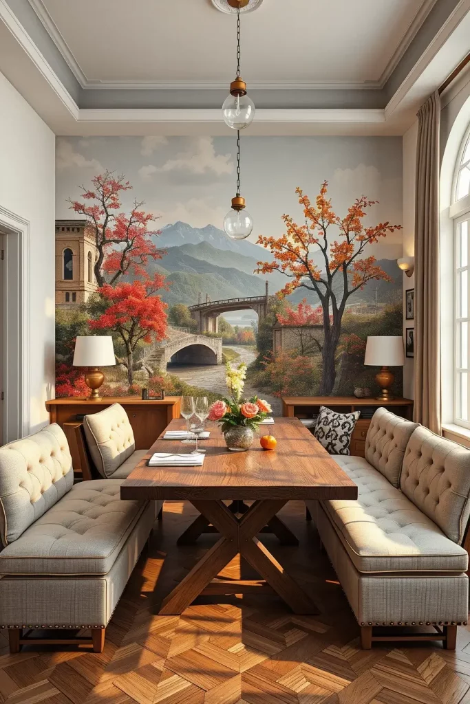I typically create these murals with neutral colored furniture so the art is the focal point. Simple wood dining tables, upholstered benches, and storage solutions that are minimal in design complete the wall without stealing the show. A couple of accent lamps or plants can also assist in grounding the design.
