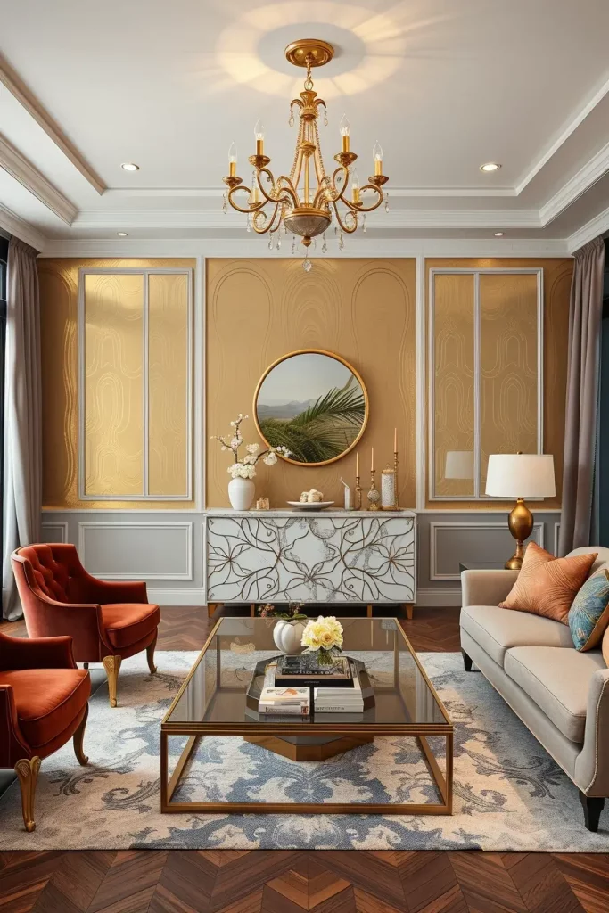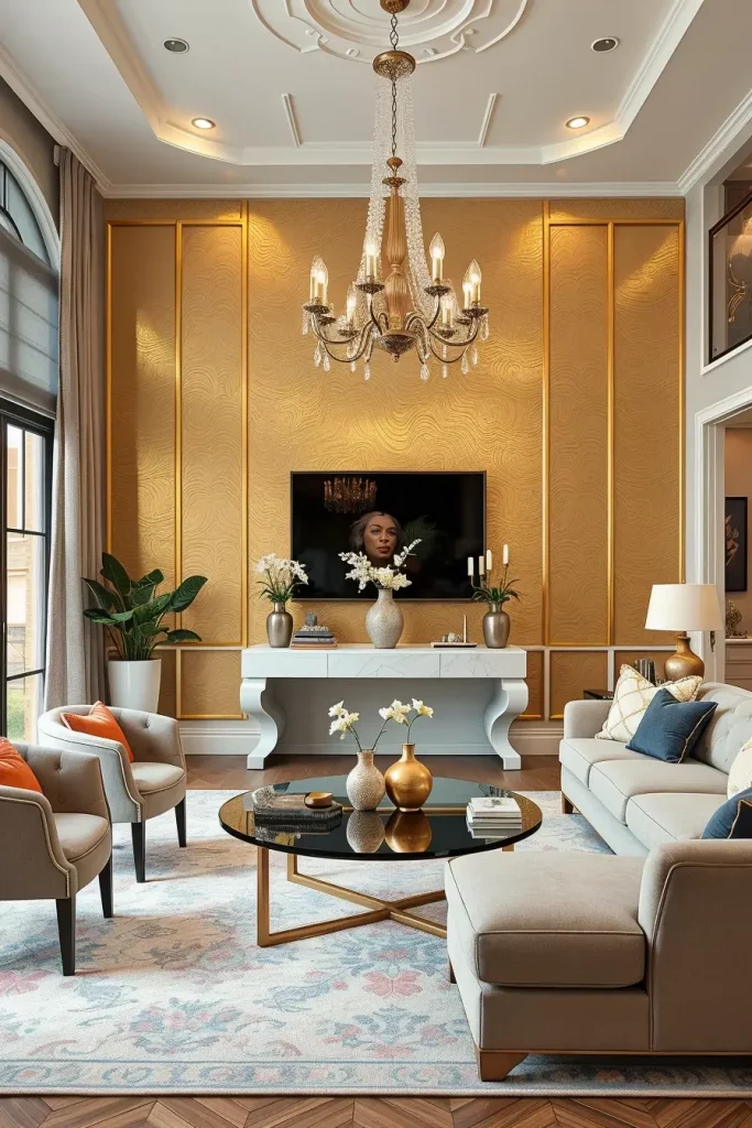 I tend to use velvet chairs, glass-top coffee tables, or marble consoles to support these metallic walls. White or beige neutral sofas go well with bronze or gold walls, and silver furniture looks good with darker toned furniture.