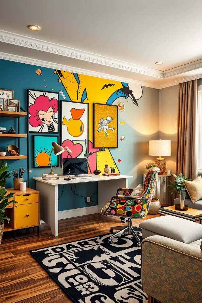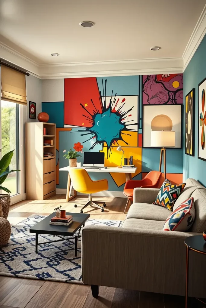 I prefer to match pop art walls with minimalistic furniture- sleek desks, colorful accent chairs or neutral sofas that do not distract attention. The playfulness can be complemented by adding accessories such as graphic rugs or bold lamps without being overpowered by them.
