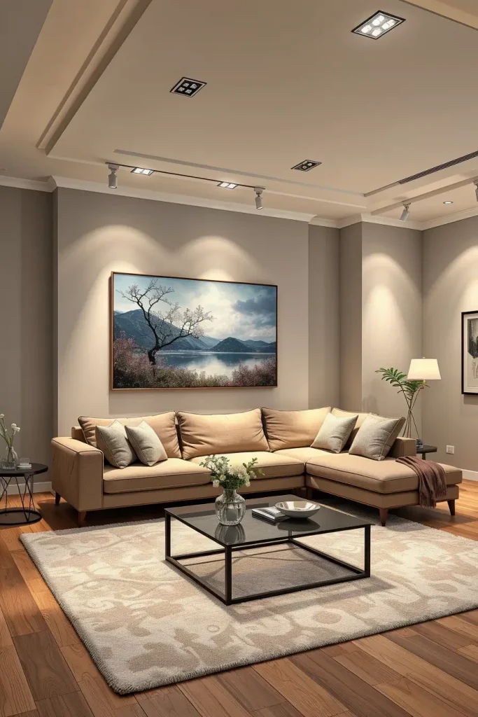When designing these spaces, I would advise dimmable spotlights to create flexibility in the different times of the day. By pairing them with minimal, yet luxurious furniture- streamlined sectionals, glass coffee tables and soft area rugs- the art is put in the spotlight.