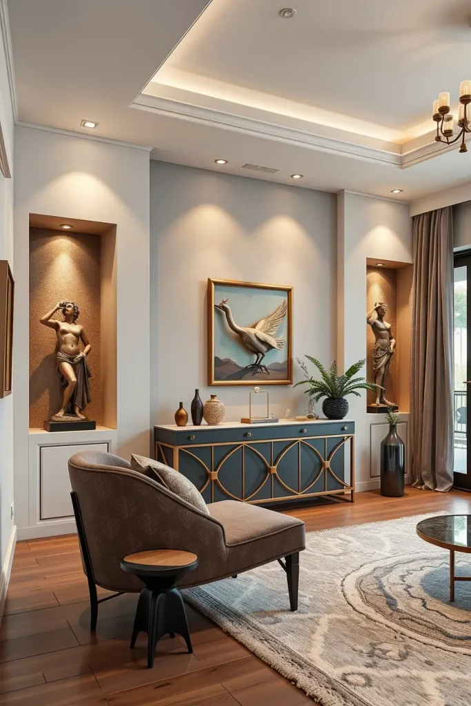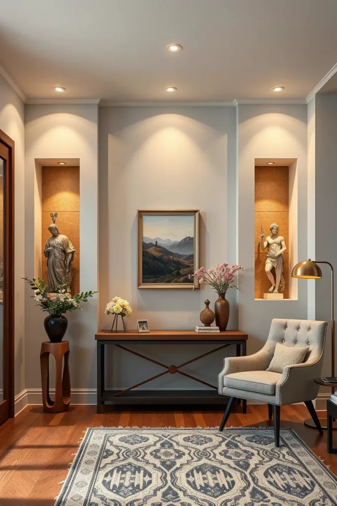 I incorporate recessed lighting into the styling of these niches to create emphasis, as well as, carefully chosen furniture like console tables or accent chairs in the vicinity. A textured rug underneath or a minimalist floor lamp nearby will provide the balance. These extensions lead the eye in a natural direction to the niche.