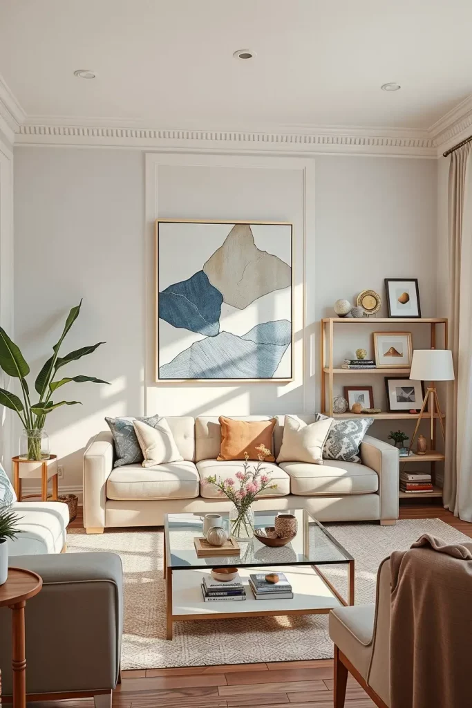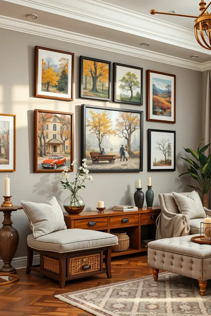I suggest modular gallery frames or shelves mounted on the wall so that it is easy to switch. Complementary furniture, such as wooden consoles, storage benches, or ottomans, will serve as a base without distracting the viewer. Seasonal decorations like little vases or candles will unite everything.