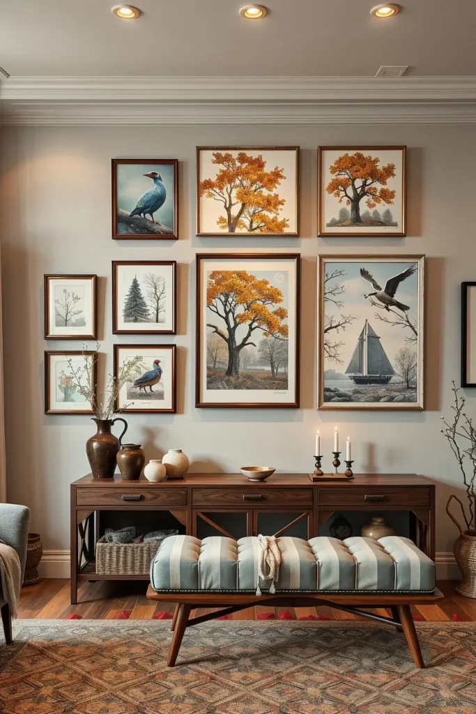In my view, seasonal art walls are flexible without significant investments. Better Homes & Gardens frequently recommends changing home decorations with the seasons, and I think the best place to do that is with wall art. Clients enjoy it because it makes decorating into a ritual